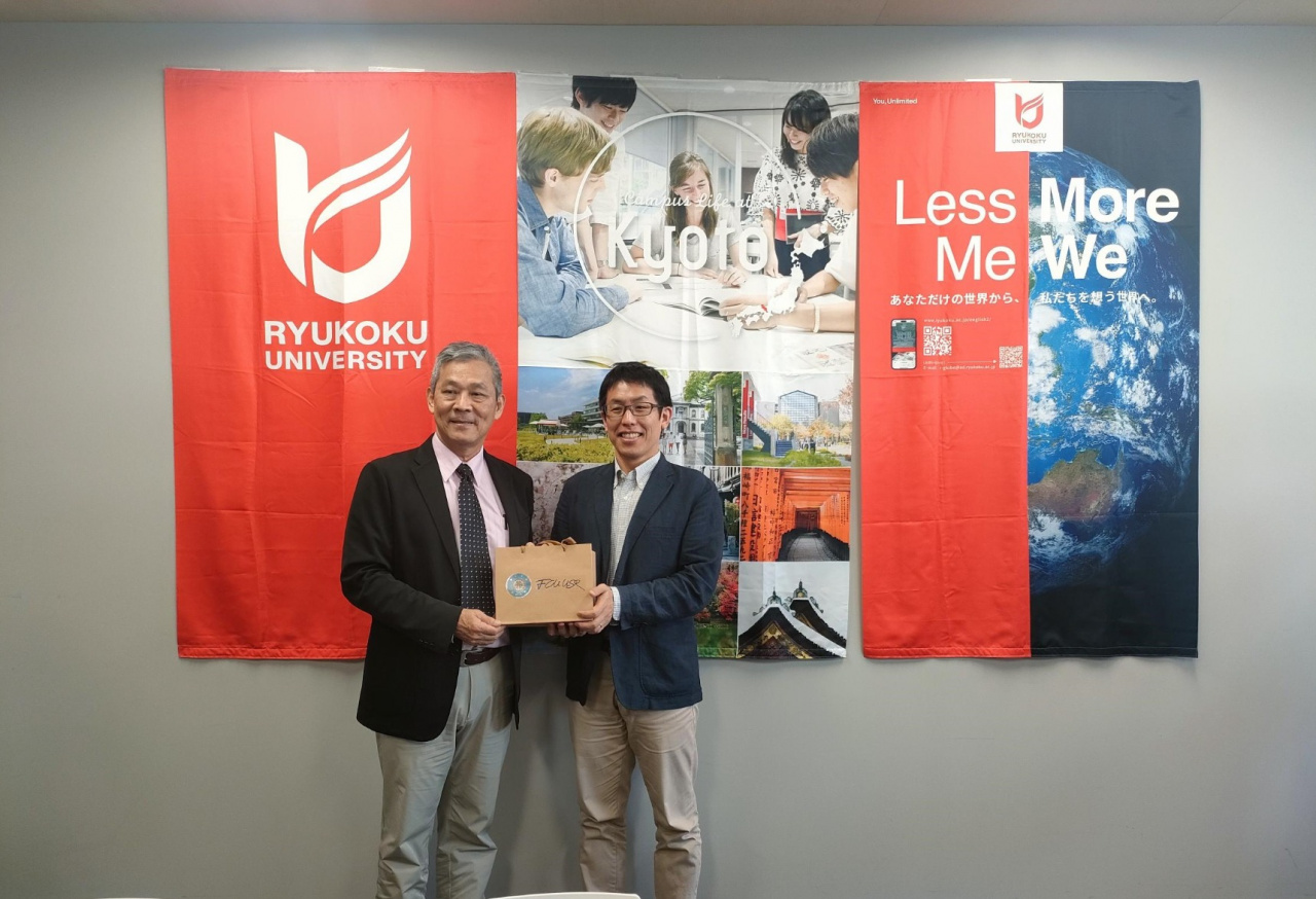 一行は深草キャンパス内に設置された太陽光発電パネルの設置場所を視察した後、本学国際学部の八幡耕一教授(グローバル教育推進センター長)およびグローバル教育推進センター事務部職員とともに、今後の学生交流プログラムなど交流推進に向けた意見交換を行いました。