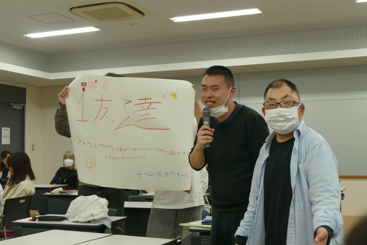 加藤博史先生による「コラージュを通して学ぼう」の講義では、ふれあい生の想いが表現できるような素材を学生がともに選択して切り取り、自由に画用紙に貼り付けた作品を発表しました。これらの作品は、現在café樹林でコラージュ展として掲示されています。伊藤優子先生の「介護を学ぼう」の授業では、健康で生活するために実践されている介護予防のゲームや脳トレを一緒にいっぱい考えて、タオル体操で積極的に体を動かしました。黒川雅代子先生による「あなたが一番大切だと思うものは何?」では、自分にとって一番大切なものを選択肢の中から選んでグループのメンバーと共有して、グループの意見をまとめて発表しました。阪口春彦先生の「世界の国を知っていますか」の授業では、戦争のない世の中にするために、ふれあい生や学生ができることについて具体的に話し合い、発表しました。