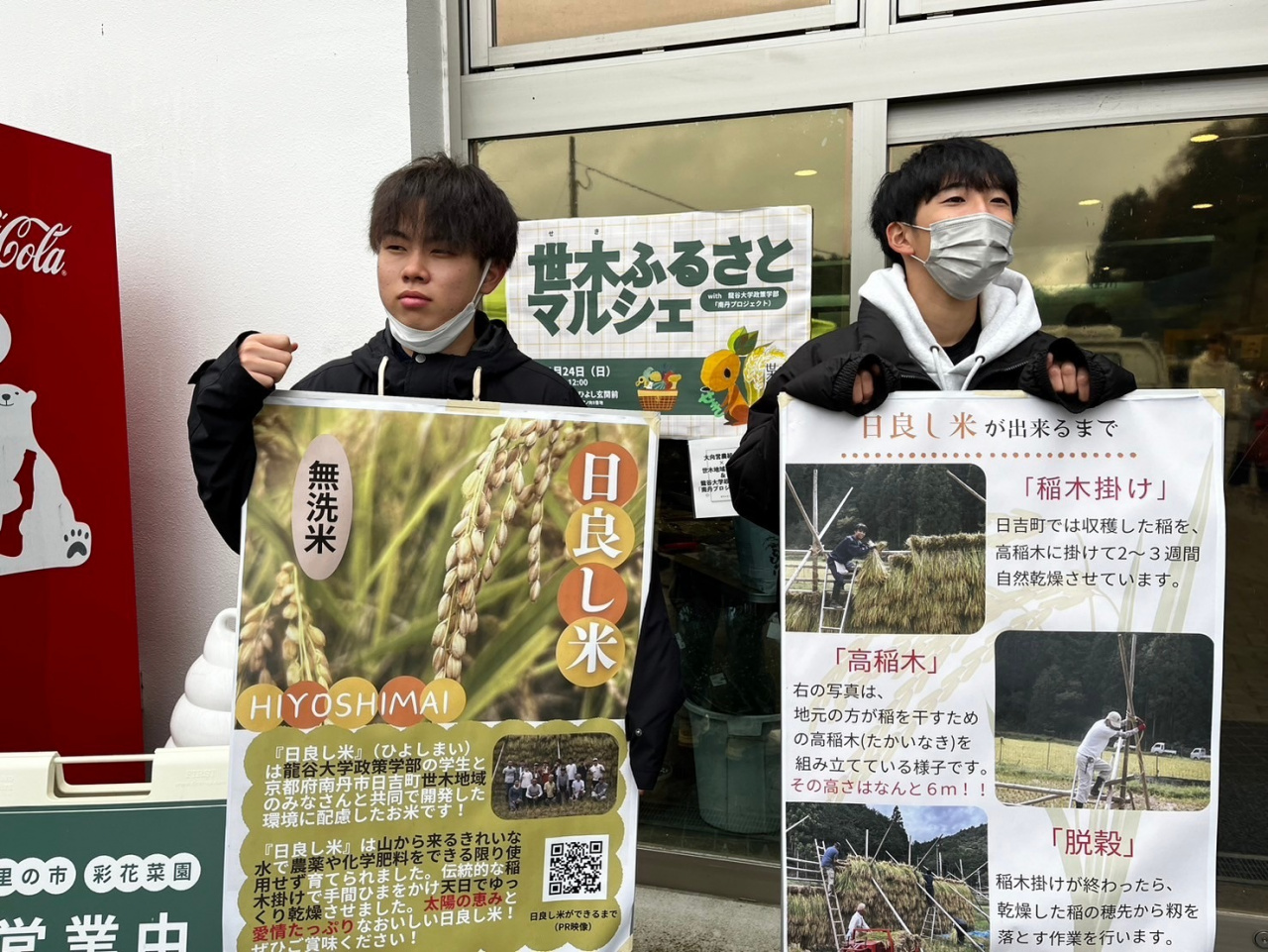 2024年11月24日(日)、道の駅スプリングスひよし(京都府南丹市日吉町 中宮ノ向8)で、「政策実践・探究演習」(国内)南丹プロジェクトと地元の世木地域振興会が共同企画した「世木ふるさとマルシェ」が開催され、学生6人(2、3回生)、教員1名(大石尚子教授)が運営に参加しました。