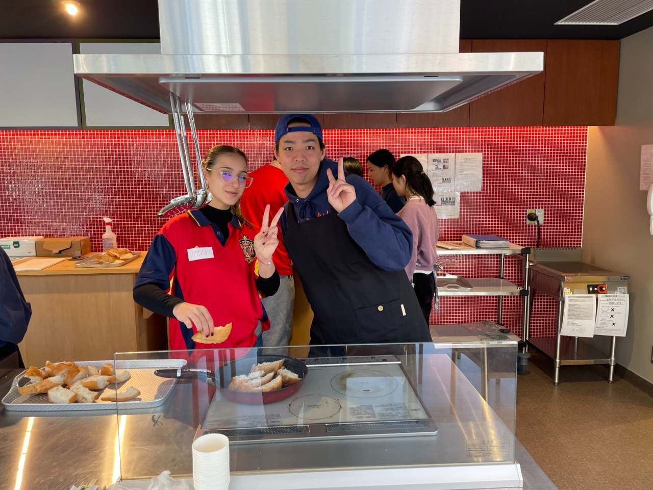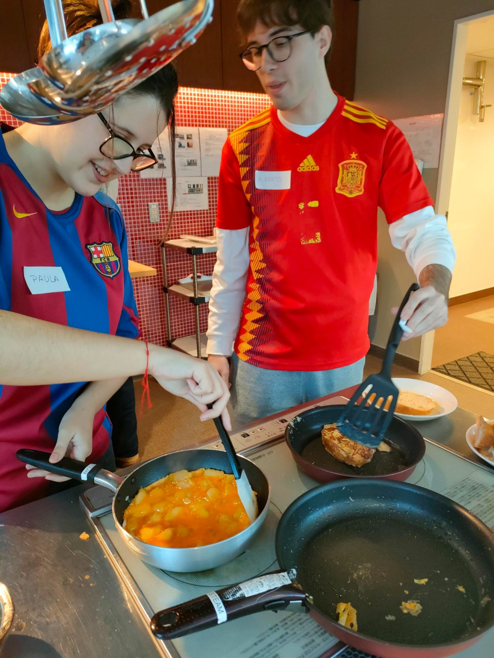 スペインのバルセロナ自治大学、バレンシア大学から本学に留学中の交換留学生3名、Paulaさん、Imanさん、Albertoさんとスペイン料理「トルティーヤ・デ・パタタ(玉子焼き料理)」と「フレンチトースト(シナモンとオレンジ風味)」等を作りながら、英語・スペイン語・日本語で交流をしました。瀬田キャンパスや深草キャンパスに所属する学生11名が参加。スペインの家庭料理について下準備から作り方まで教わり、おいしくて楽しい異文化交流ができました。