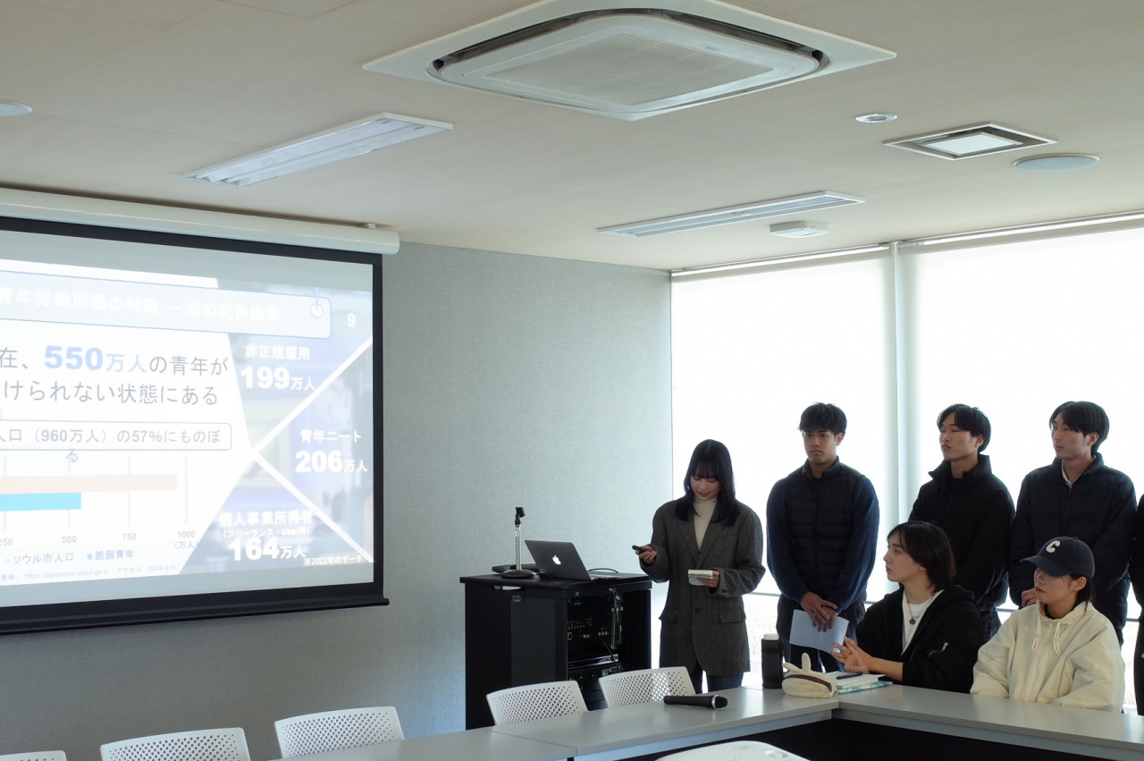 韓国PBLのテーマは若者政策の日韓比較です。4~7月は事前学習、9月にソウル市でフィールドワーク、10月以降の事後学習を経て、日本と韓国の若者政策、韓国における若者の現況、年間を通して学んだことを発表しました。