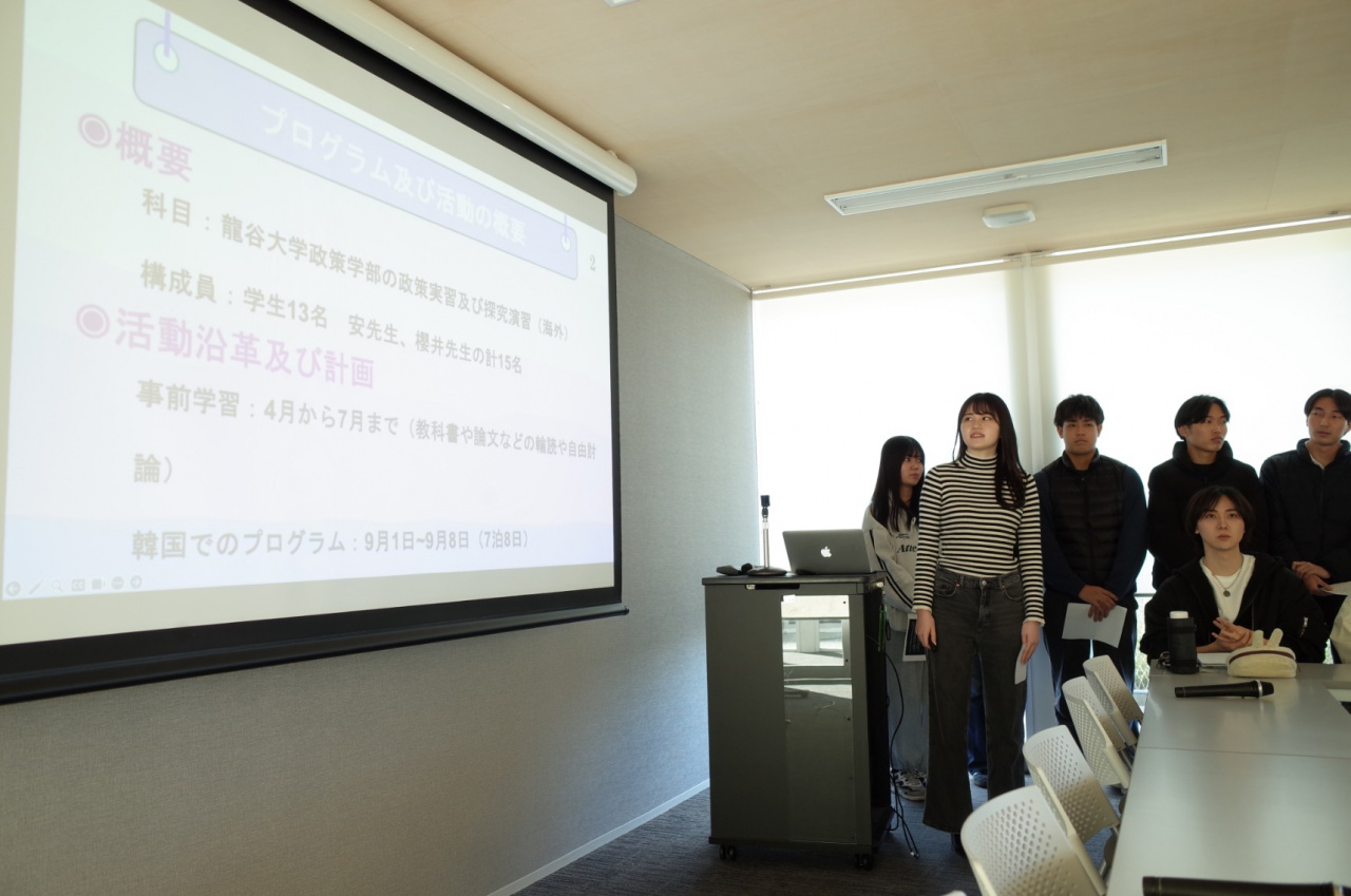 2024年12月4日(水)14:30~15:00、2024年度の「政策実践・探究演習(海外)」韓国PBL受講生13名が、政策学部教員に対して報告を行いました。