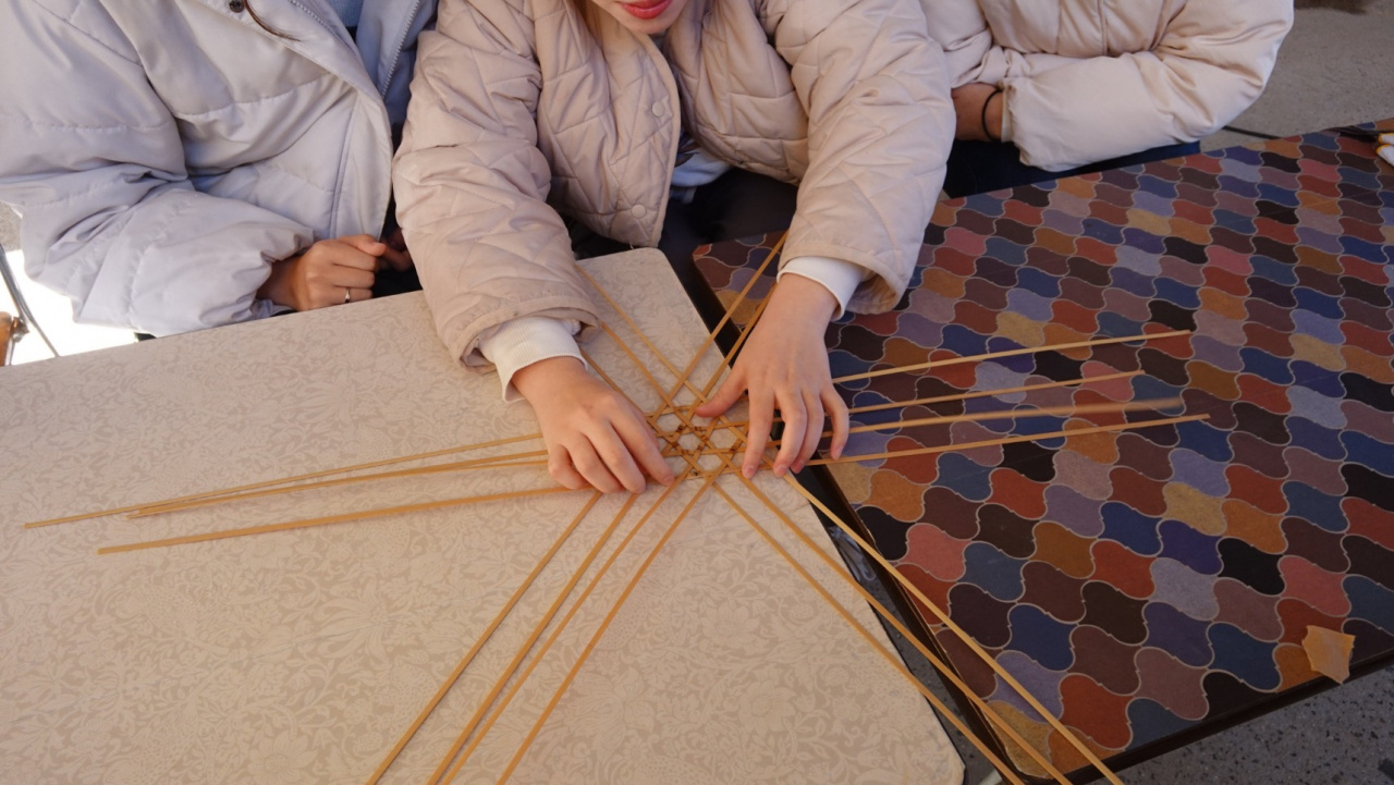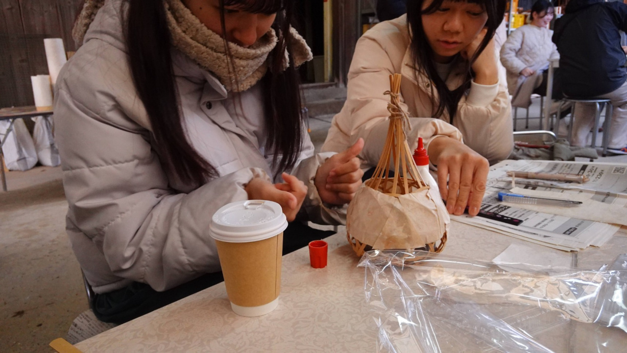 午後は、午前中に制作したたまねぎ型の外形に、前回のフィールドワークで漉いた和紙を貼り付けるチームと、新たに2つ目のたまねぎ型ランプシェードを製作するチームに分かれて作業を進めました。和紙を貼るチームは、たまねぎの形を損なわないよう細かく切りながら、何度も調整して丁寧に貼っていきました。六つ目編みを担当するチームは、途中かざぐるまの製作で練習しつつ、最終的には一人でもかなりの段階まで作成できるようになりました。