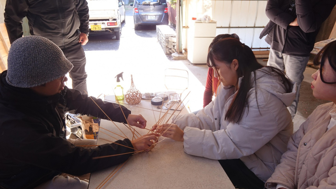 今回のフィールドワークの目的は、以前から計画していたたまねぎ型のランプシェード制作を進めることでした。10月に行われた前回のフィールドワークでは、竹をくり抜いたり輪切りにしたりしてランプシェードの骨組みを作りましたが、その加工の難しさに直面しました。