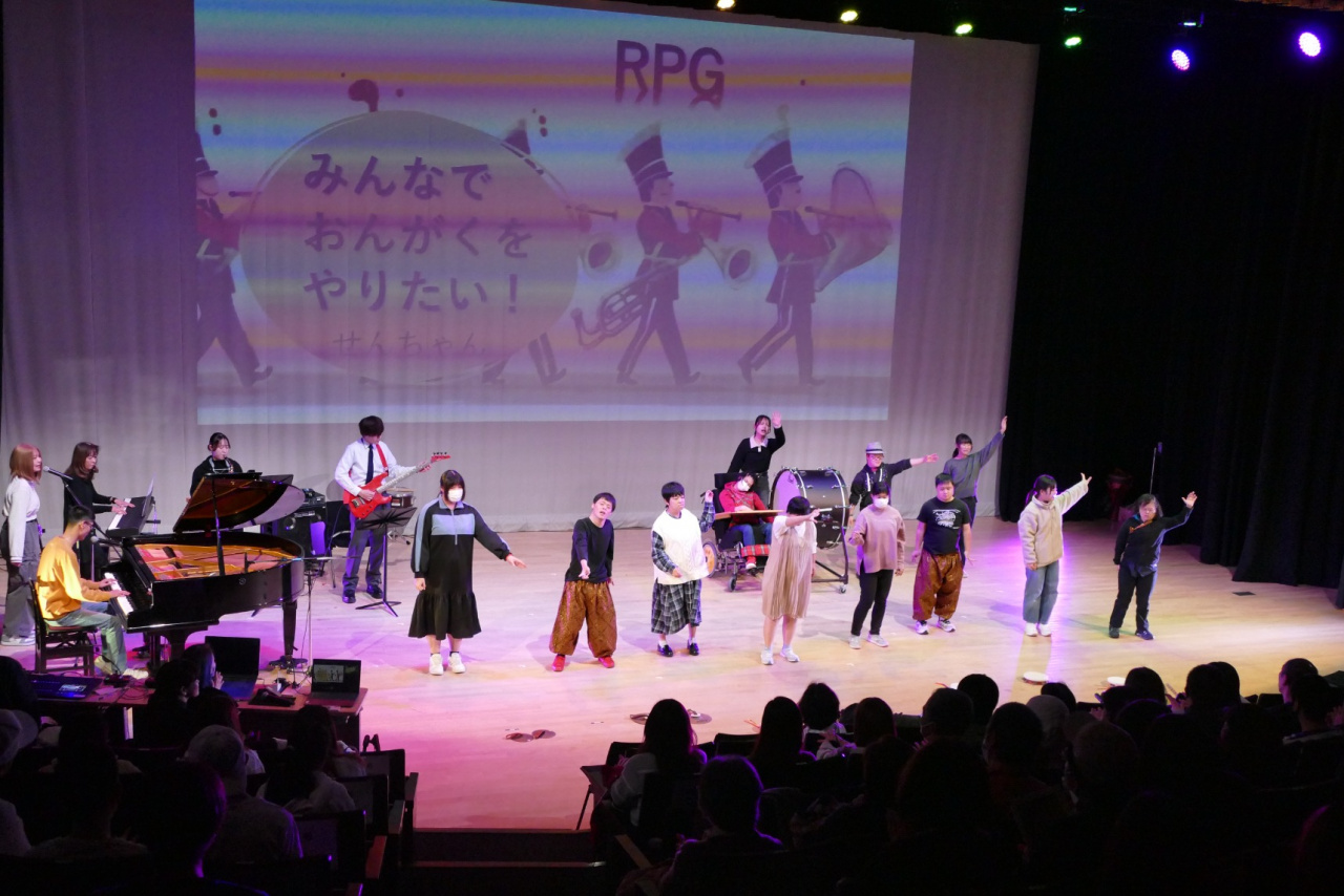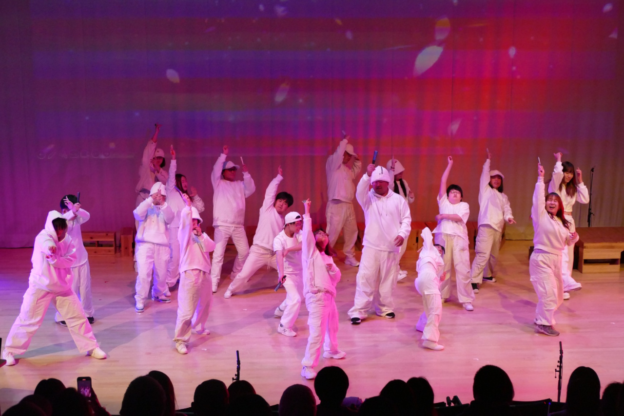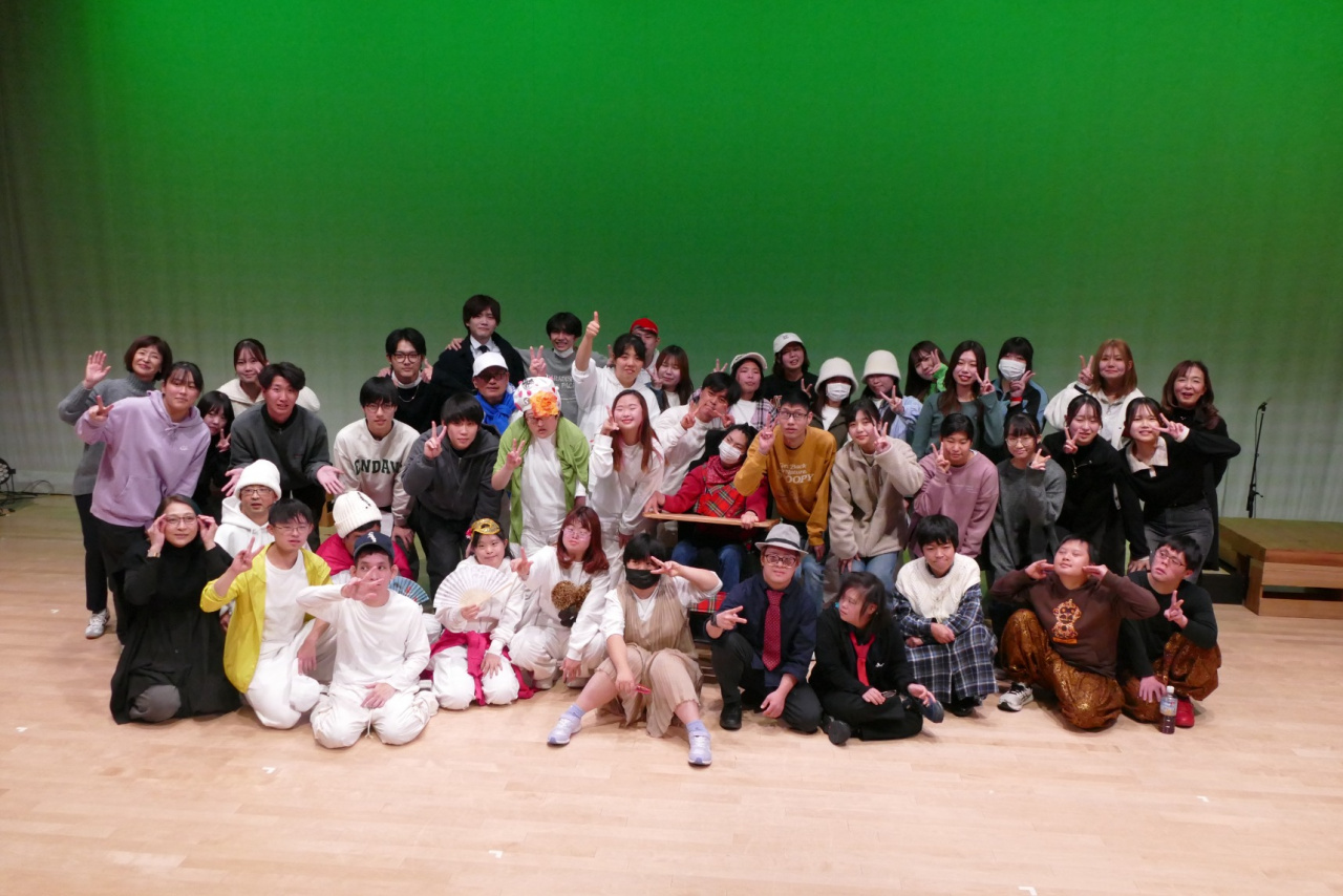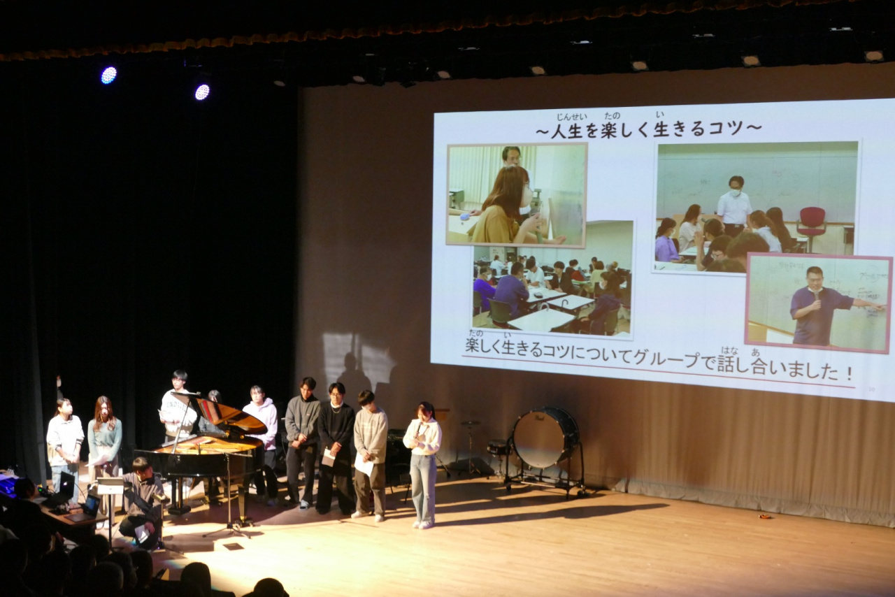 まず、3講時の学習講座の取り組みについて、龍大生から紹介されました。音楽療法クラス(担当:市原幸子先生)では「夢をつなぐ」が発表されました。ふれあい生それぞれの夢を助け合い、励まし合い、知恵を出し合って楽曲とともに舞台で実現していました。続いて、懐かしい22年分の記録写真とともに、教員からのリスタートへのメッセージ動画を視聴しました。会場にはふれあい大学の修了生もたくさん来られており、大きな拍手をいただきました。演劇療法クラス(担当:平山久美先生)では、「Change!(チェンジ)」が発表されました。2750年の未来人類は、脳に埋め込まれた通信機器で何も考えず、行動しなくなっていたが、自分で考え、選び、行動しなければならない2024年にタイムスリップして…、というストーリーでした。本番直前まで熱心に練習をしてきた成果を存分に発揮できて、最後のフィナーレを笑顔で飾れた楽しい発表会となりました。