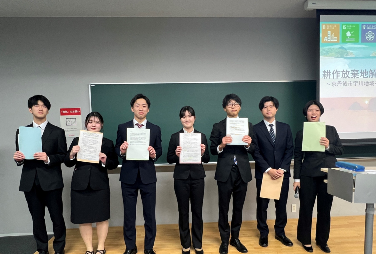 今里ゼミは「耕作放棄地解消と圃場整備・法人化の重要性 ‐京丹後市宇川地域を事例として「持続可能な地域社会」を創るために」というタイトルで発表を行いました。この研究は、持続可能な地域社会の構築に向けて、京丹後市宇川地区の耕作放棄地問題に着目し、その解決策として圃場整備の有効性と農業法人経営の健全化を提案。さらに、地域の様々なセクターの協力関係構築による地域力向上を提言しました。
