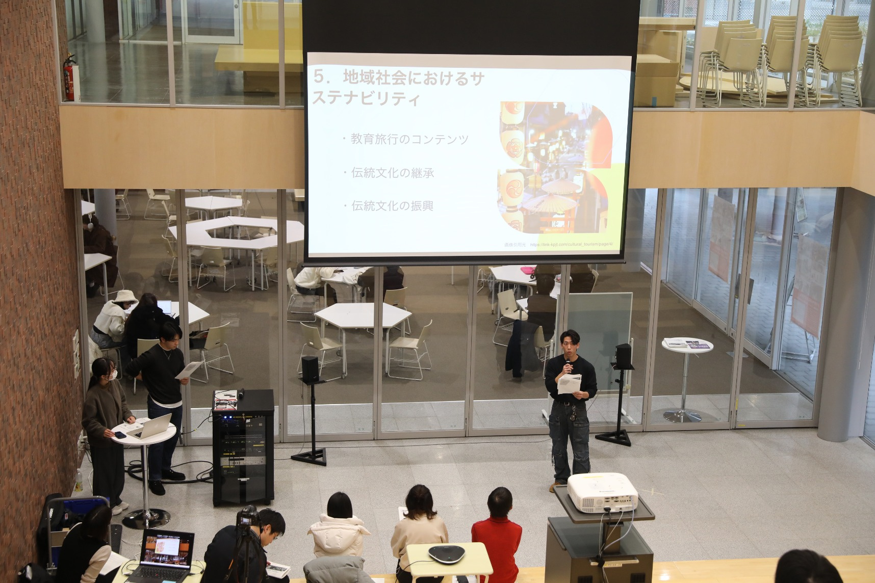 成果発表会では、観光混雑に関わる「ごみ問題への取り組み」と、「観光業が見据えるサステナビリティ」をテーマに選んだ2グループが、フィールドワークやヒアリングなどを通して考えたことを報告しました。