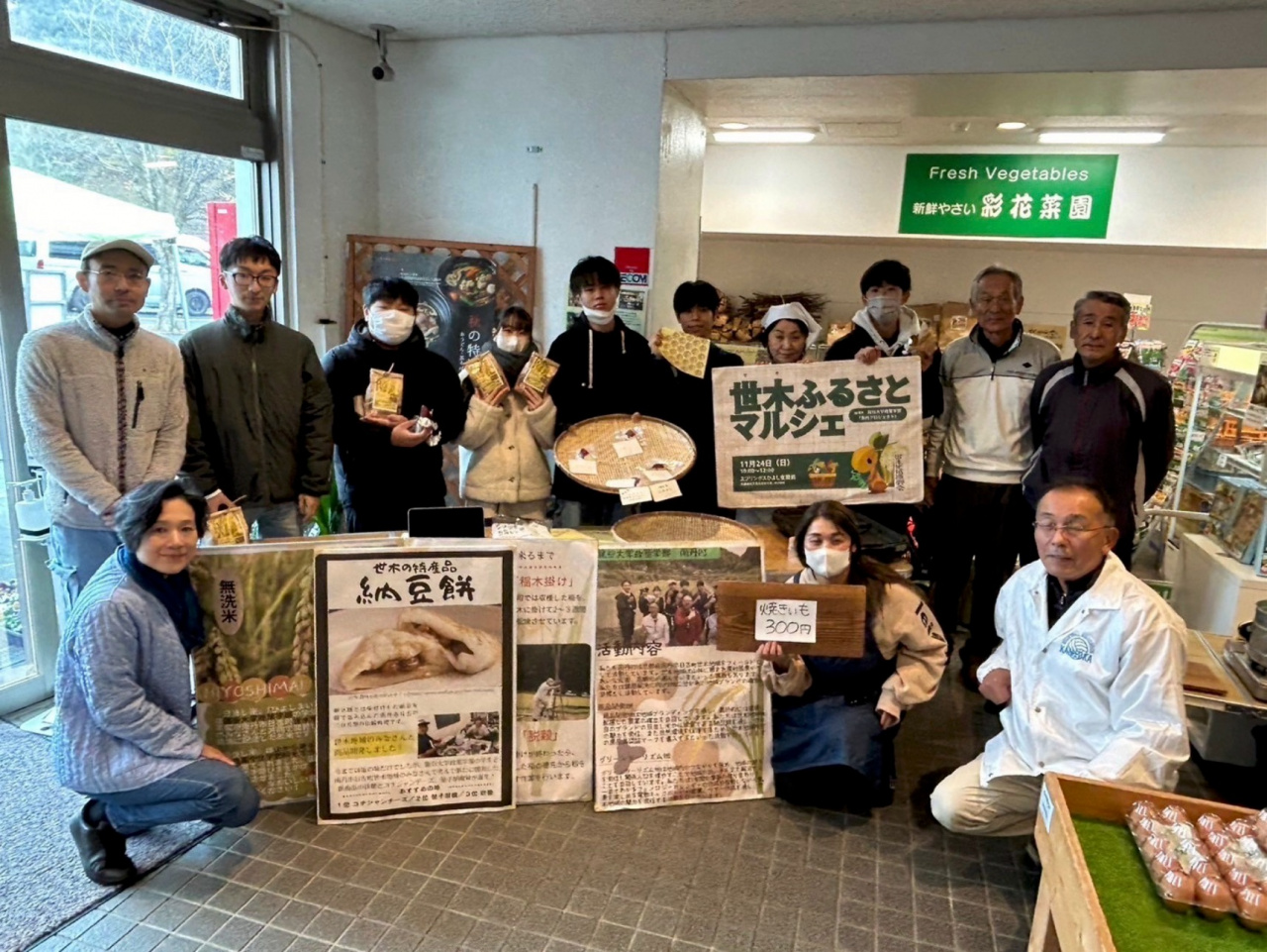 商品開発班は、「日良し米」の販売促進、地域の伝統食「納豆餅」の地域ブランド化と「世木環境農法」認証の普及に取り組みました。開発した商品は、道の駅スプリングスひよしで開催した「世木ふるさとマルシェ」で販売し、好評でした。