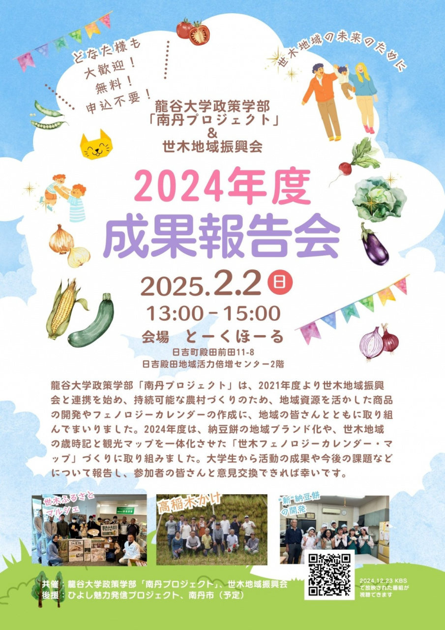 2025年2月2日(日)、殿田活力倍増センター(京都府南丹市日吉町殿田前田11-8)で、「政策実践・探究演習」(国内)南丹プロジェクト(担当教員:大石尚子教授)と地元パートナーの世木地域振興会の共催で成果報告会が開催され、学生6人(2、3回生)、教員2名が運営に参加しました。