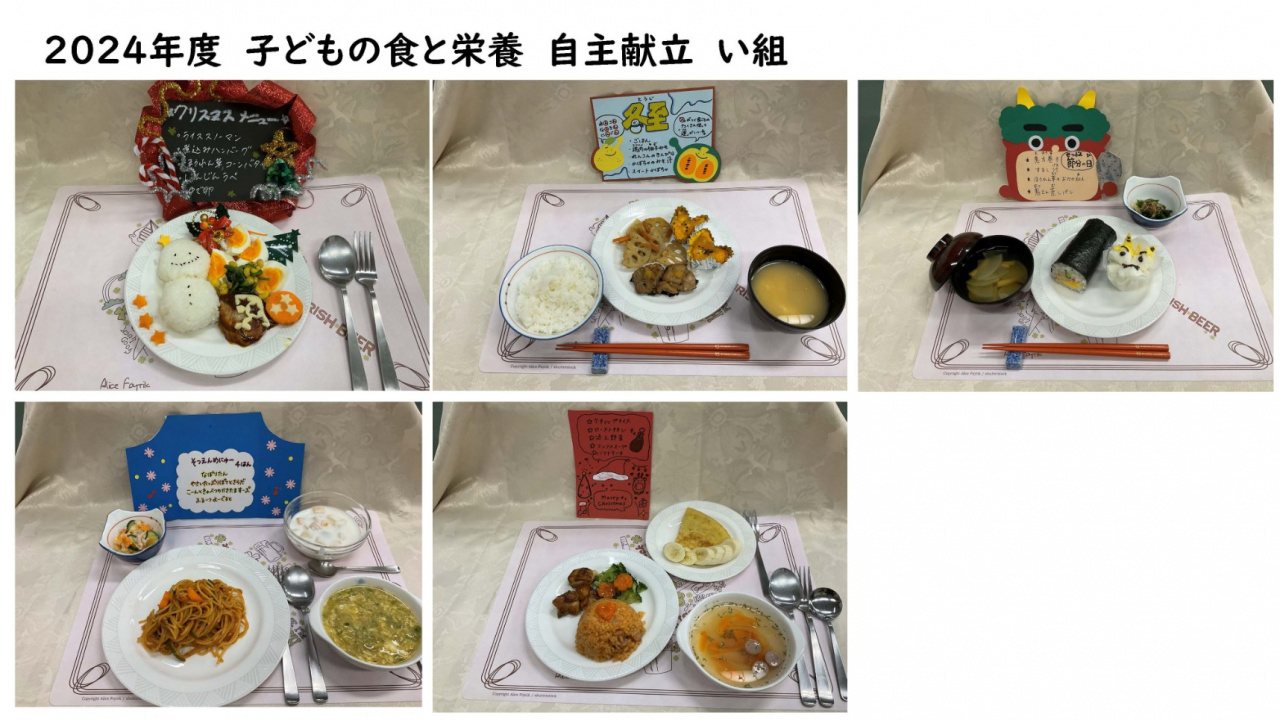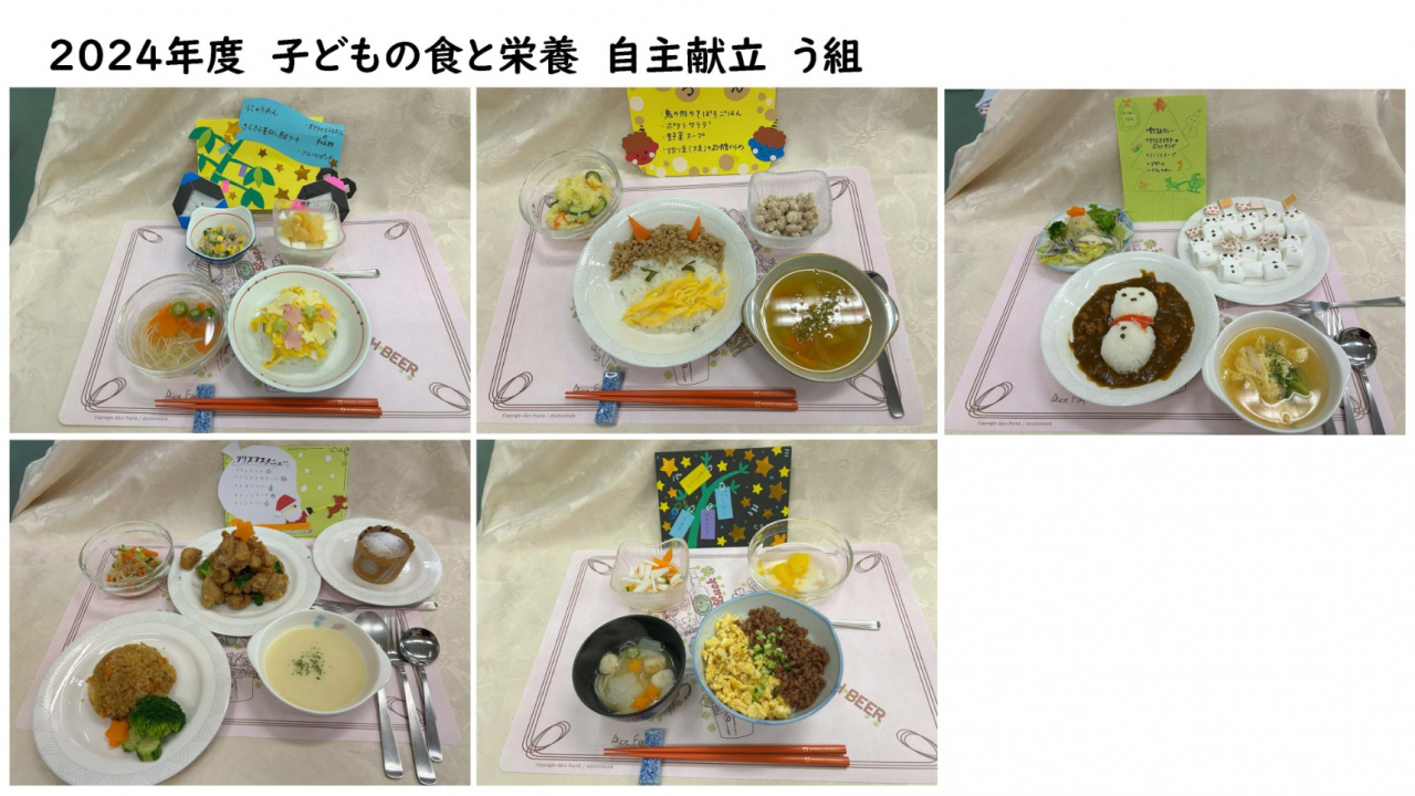 今年度(2024.12.16~12.17)も5歳児に向けた保育所(園)給食の献立内容を学生自身が考え、自分たちで食材購入し、調理を行うという演習を実施しました。保育者を目指す学生にとって、食に関わる知識や技術を体得する機会が少なくなり、自立した生活の基礎となる「食生活の自立」が難しい現状を踏まえ、「食」をより身近なものとして捉え、「食べることの大切さ」を幼児たちに伝えることについて学び、そして自身の食生活を見直す機会となる重要な実習となりました。
