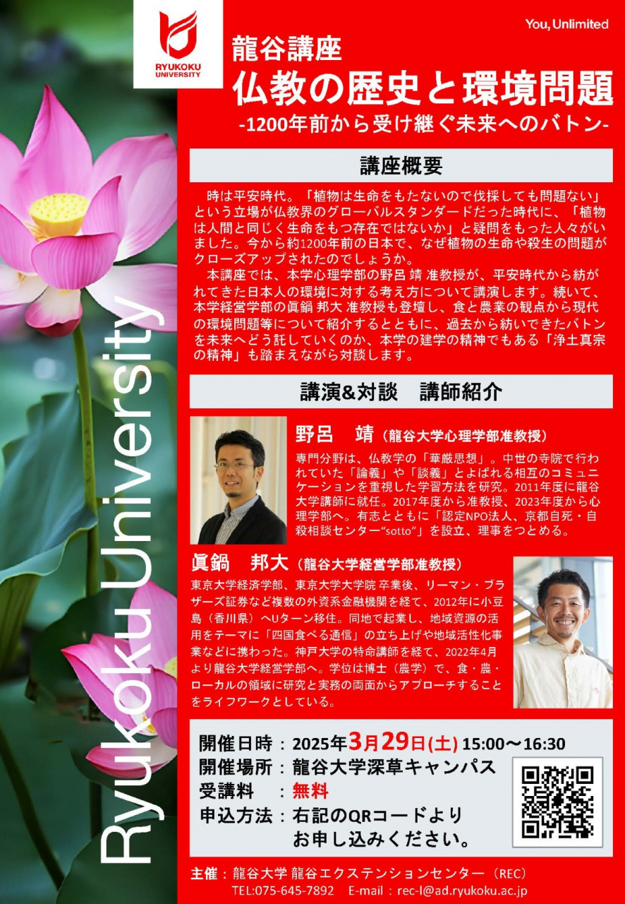 本講座では、本学心理学部の野呂 靖 准教授が、平安時代から紡がれてきた日本人の環境に対する考え方について講演します。続いて、本学経営学部の眞鍋 邦大 准教授も登壇し、食と農業の観点から現代の環境問題等について紹介するとともに、過去から紡いできたバトンを未来へどう託していくのか、本学の建学の精神でもある「浄土真宗の精神」も踏まえながら対談します。