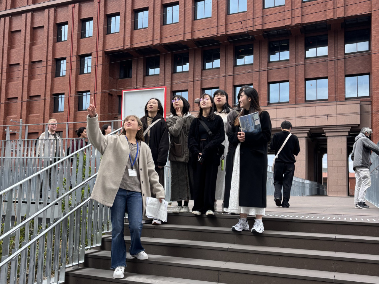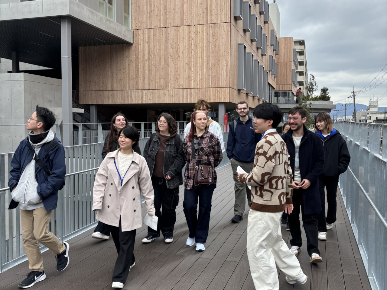 その後、キャンパスツアーがスタート。ツアーでは、日本人学生の英語ガイドがキャンパス内の主要な施設を案内しました。留学生たちは、図書館や学生食堂、語学学習スペースなどに興味津々といった様子で、時折メモを取る姿も見られました。移動中には、留学生同士が日本語で会話をする場面や、異なる文化・言語について語り合う様子もあり、交流の輪が広がっていきます。中でも注目を集めたのが、新棟「灯炬館」の紹介です。ガイドが「開放感のある空間で、勉強や休憩、グループ活動にも使える」と話すと、学生たちの表情にワクワク感が広がります。京都タワーや街並みを一望できるテラスでは、思わず歓声を上げる留学生の姿も。「こんな環境で学べるなんてすごいね」と友達と話しながら、未来の自分を重ねるようにキャンパスを眺めていました。