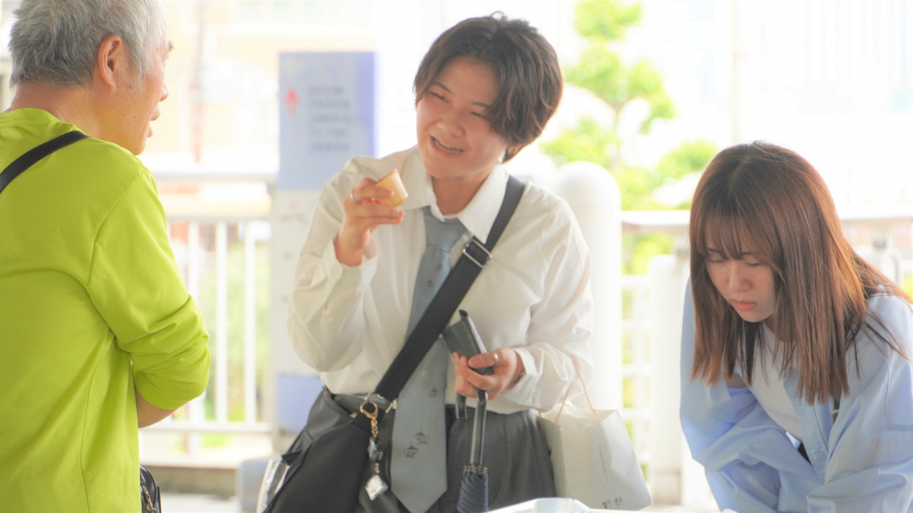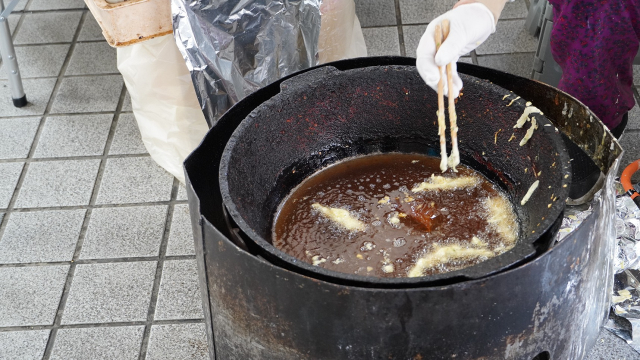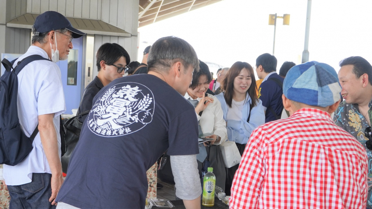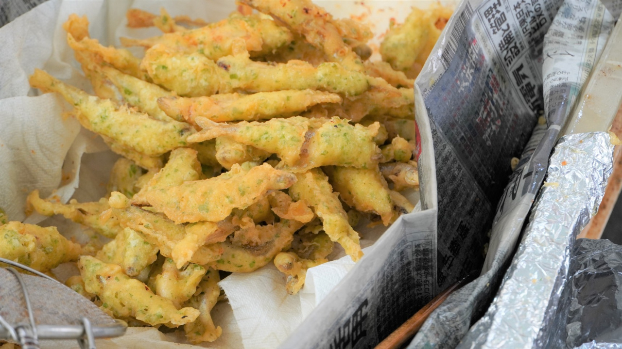 琵琶湖に浮かぶ沖島の皆さんが、琵琶湖で漁獲した新鮮なワカサギを天ぷらにして販売されていました。教員と学生たちも、この「湖の幸」を味わいました。