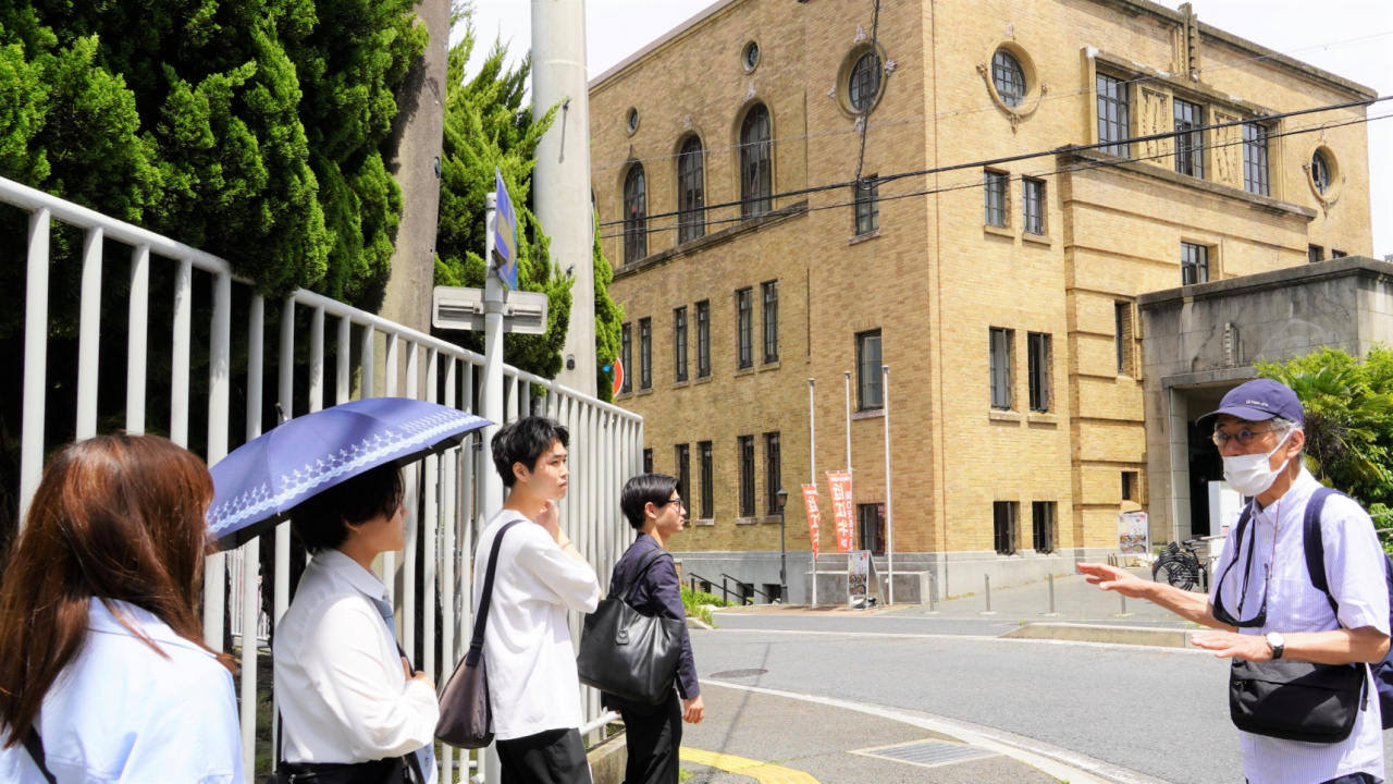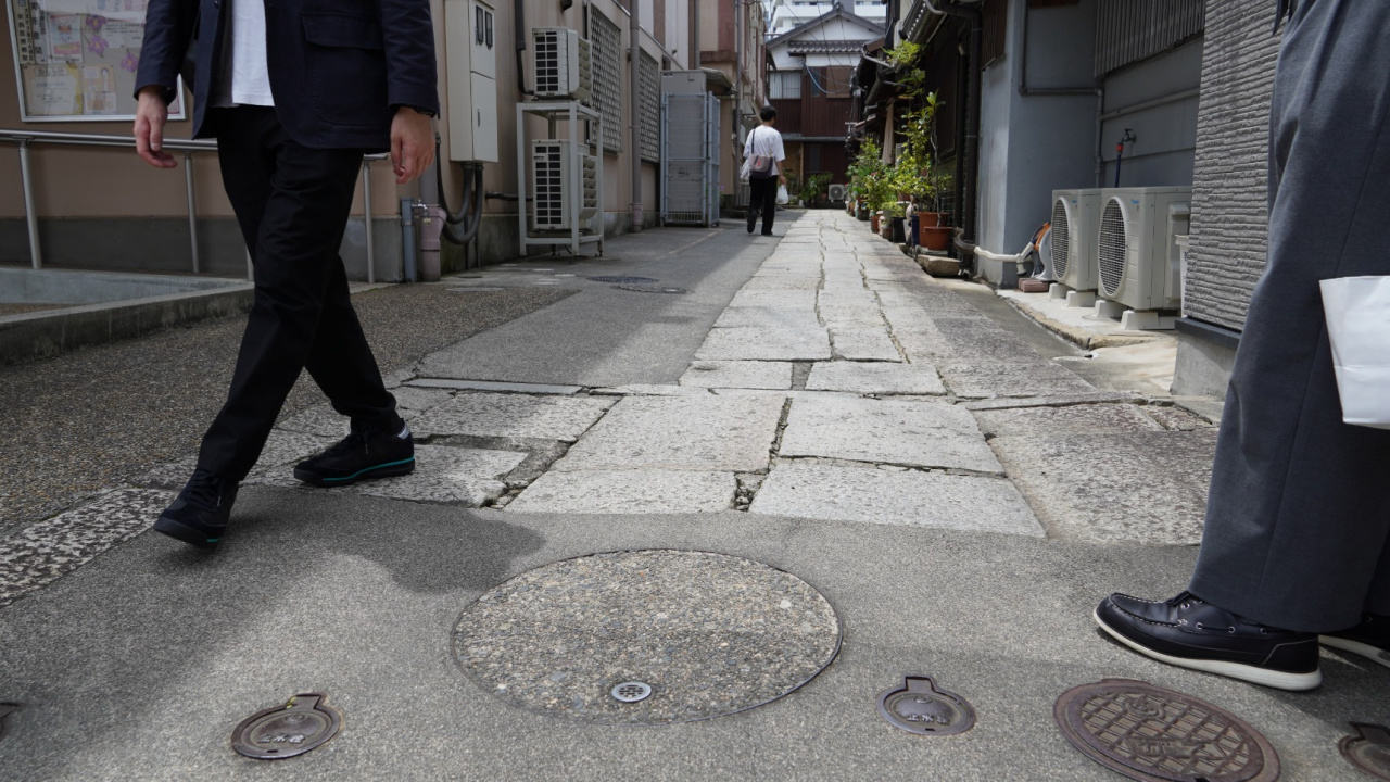 それらの学びをもとに、5/18(日)に「大津市中央学区」に赴き、実際にまち歩きをおこないました。まち歩きでは、要所で担当教員による解説がなされました。