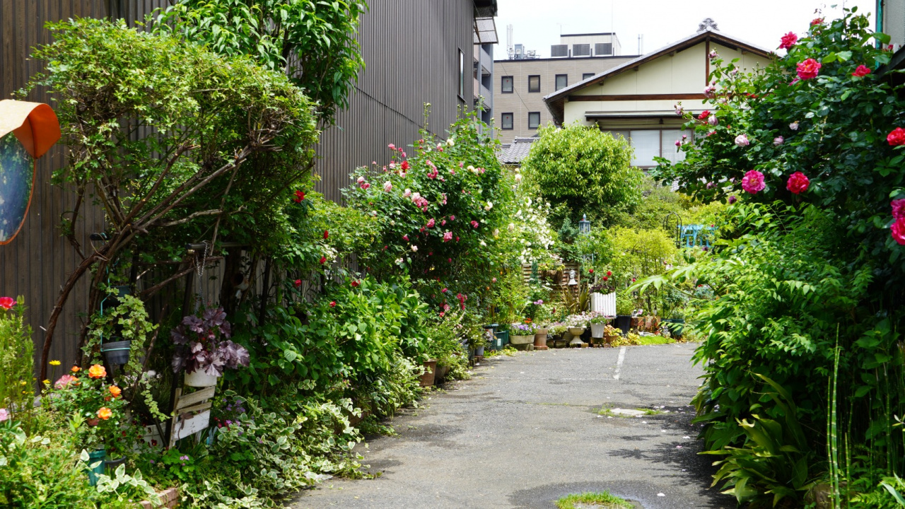 かつての町家の「庭」は狭かったわけですが、家を建て替えて、町家がなくなった敷地にたくさんの鉢植えを並べて緑を楽しんでおられる様子も拝見できました。軒下に鉢植えを並べておられるお宅もたくさんあります。これも、まち歩きの楽しみのひとつだと思います。