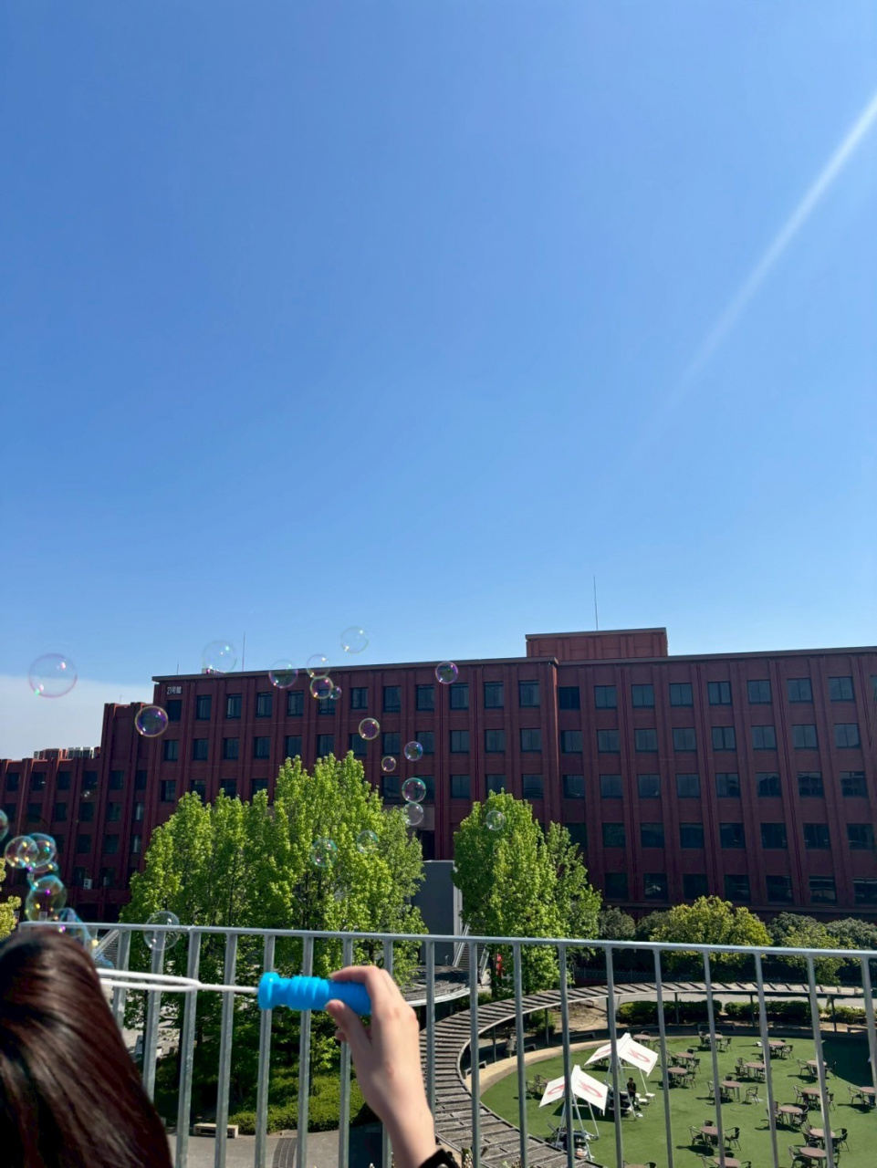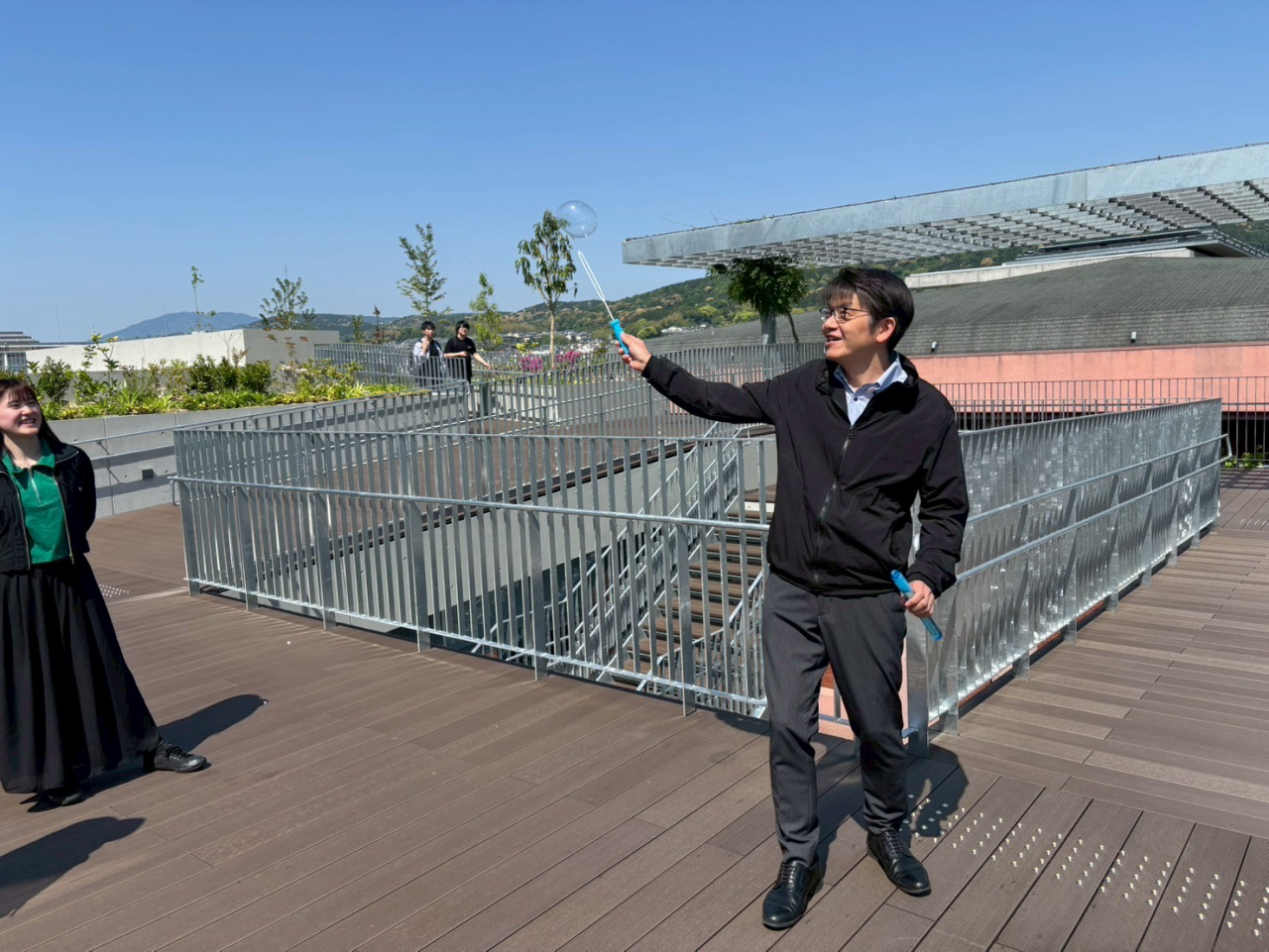 「しゃぼん玉なんて小学生以来だけど、こんなに楽しかったけ?」「灯炬館の屋上テラス、気持ちいい~」「大きなしゃぼん玉をつくるぞ!」など、約1時間余りみんなでしゃぼん玉を楽しみました。