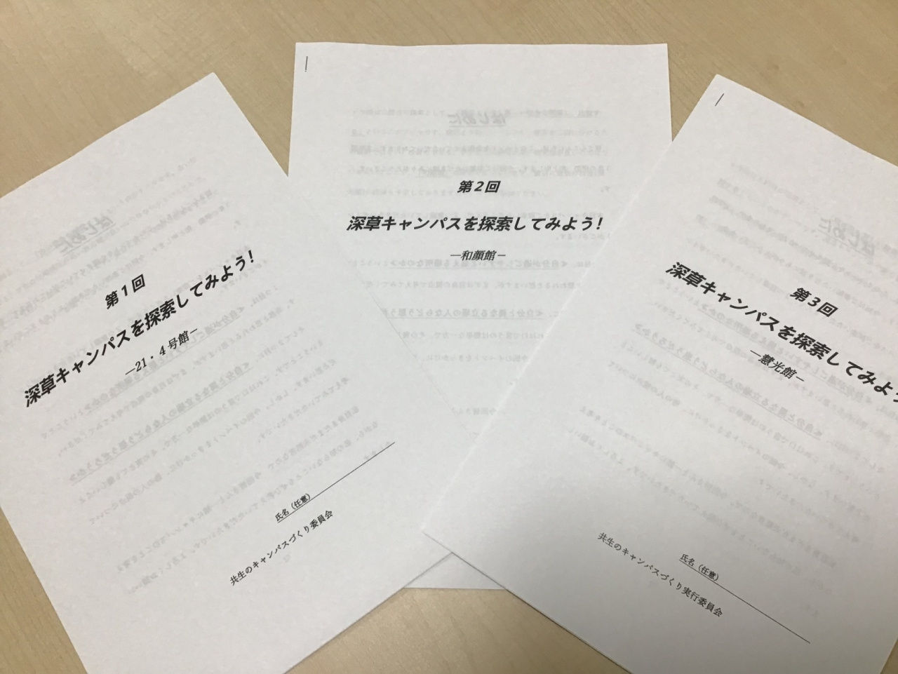 続いて、予め作成したワークシートに基づき、探索する場所と視点を確認し合いました。説明後はグループに分かれ大学施設内を巡り、最後集合し探索結果や感想を報告し合いました。
