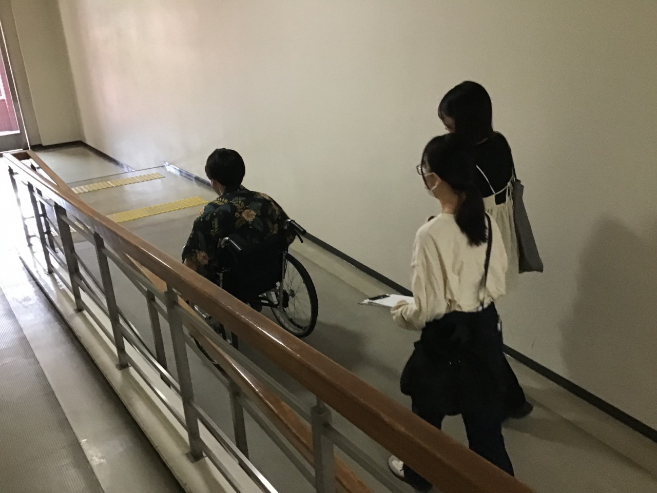 参加した学生からは「車いすに乗ってみると、開き戸の教室は一人で出られなくなることに気づいた」、「階段の手すりが両側にない場所がありこれまで昇降に困っている人がいたが、慧光館は両側に設置されており、少しずつ改善されていることがわかった」、「施設や設備の整備だけでは限界があることがわかり、誰もが『困っている』と言いやすい環境、学生同士が声かけしやすい環境づくりが必要だと思った」など様々な意見や感想が出され、大事な気づきを得ることができました。