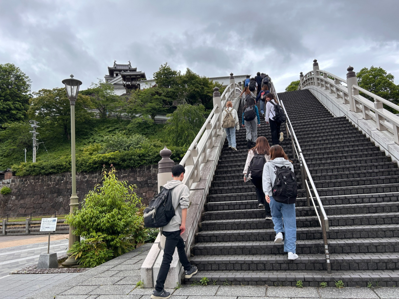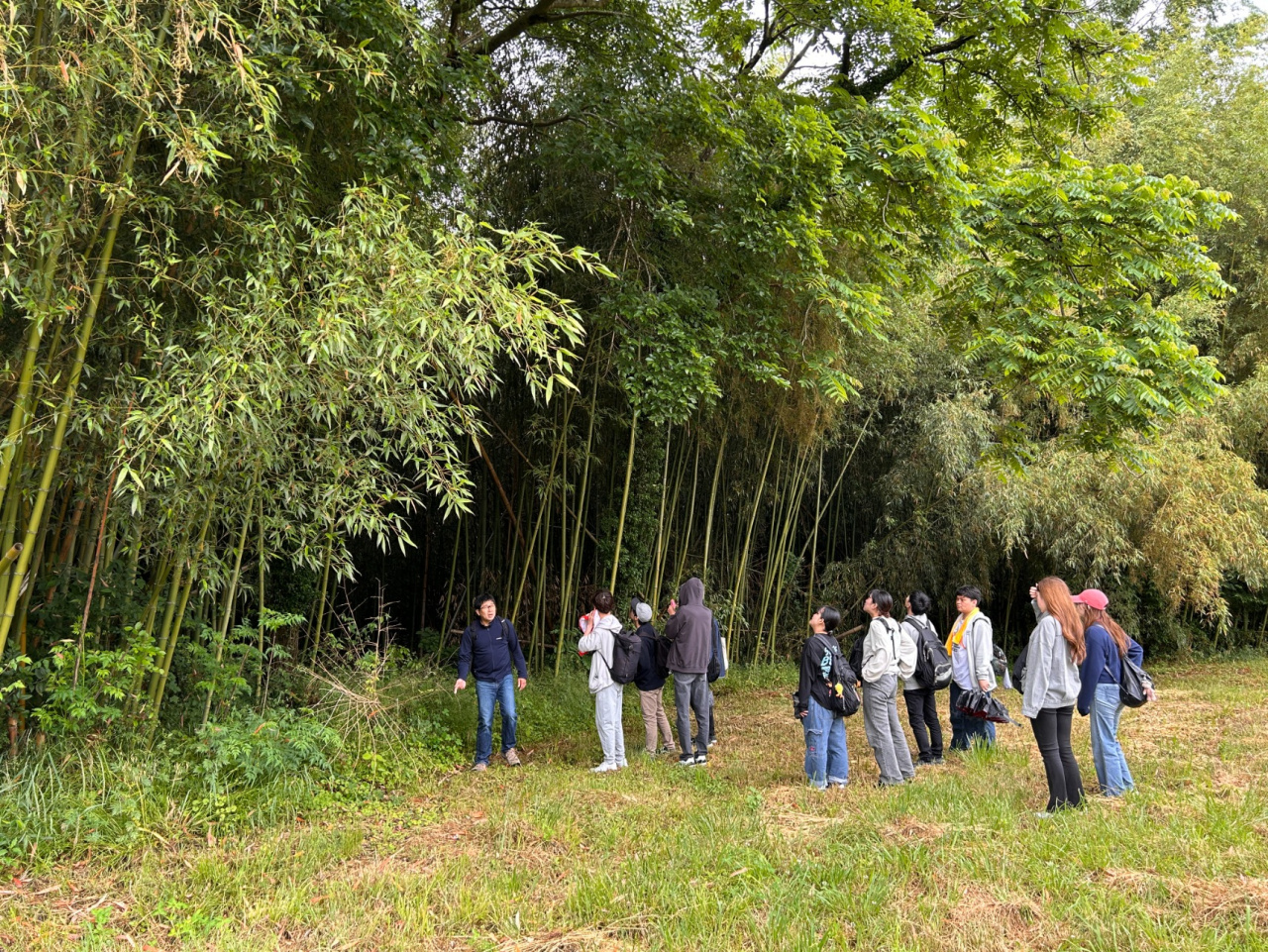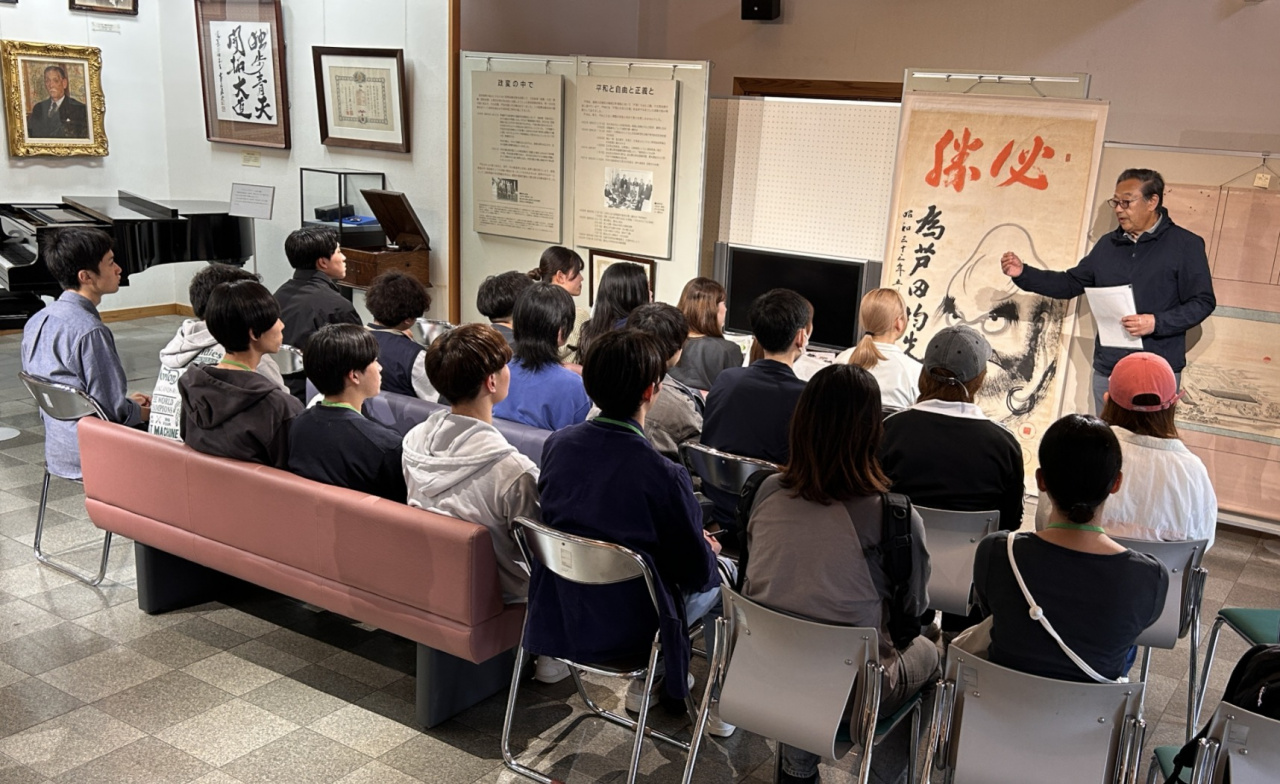 合宿2日目は、谷垣岳人先生(福知山市出身)のガイドで、福知山市内でまちあるきを実施しました。テーマは「明智光秀のまちづくりマインドと福知山の水害と治水を知る」です。ゆらのガーデンから福知山城に登り、天守閣の上から由良川と市街地、周辺の山々を展望し、展示により福知山の歴史をはじめ、城の復元への市民の取組、シティプロモーションなども学びました。福知山では「まちづくりの心=光秀マインド」として市の戦略に取り入れています。福知山城をゆっくり見学した後、由良川の堤防から中州にある「明智藪」に向かいます。光秀が由良川の改修をおこない、水流を受け止めるための竹・雑木の藪をつくったそうで、現在は野鳥の宝庫になっています。堤防沿いに「治水記念館」へ。ここでは由良川の氾濫の歴史と治水事業について学びました。福知山を知るうえで水害と治水は重要で、光秀の時代から現代まで続く課題といえます。
