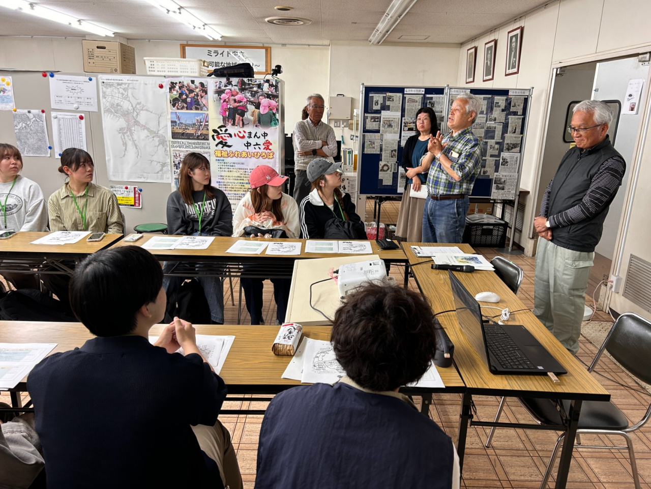 合宿初日は、今年度初めての地域訪問です。学生たちは少し緊張していましたが、中六人部ふれあいセンターに到着すると、北山会長をはじめ地域の方が笑顔で迎えてくださいました。学生たちと地域の方々がそれぞれ準備した冊子をもとに一人ずつ自己紹介しました。続いて、ミライト中六の取組を紹介いただき、地域活動の概要を知りました。福知山市まちづくり推進課の担当者も参加くださいました。