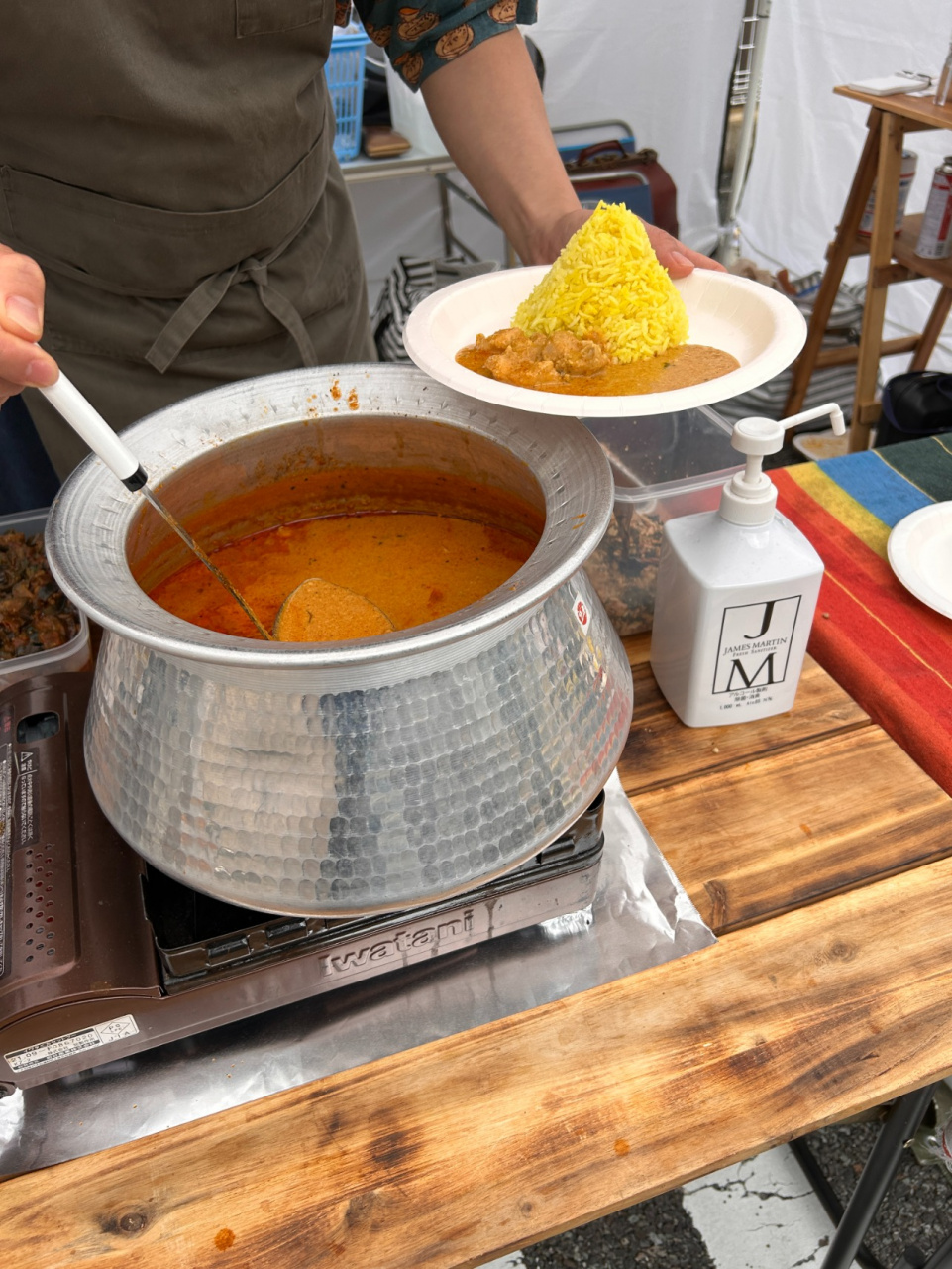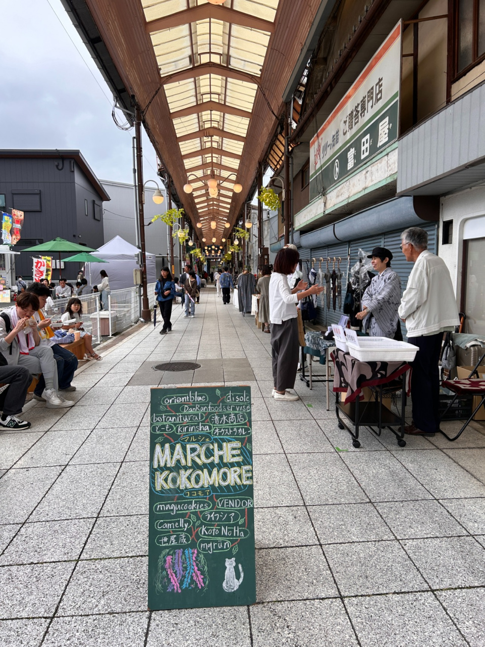 治水記念館から新町商店街へ進むと、福知山公立大学の学生団体が企画した「マルシェ・ココモア」が開催されており、手仕事の商品やキッチンカーなどこの日だけのお店が並び、通称シャッター商店街を盛り上げています。学生がまちづくりに関わる実例を「マルシェ・ココモア」で体験することができました。学生たちも昼食にハンバーガー、スパイスカレーなどを楽しみました。