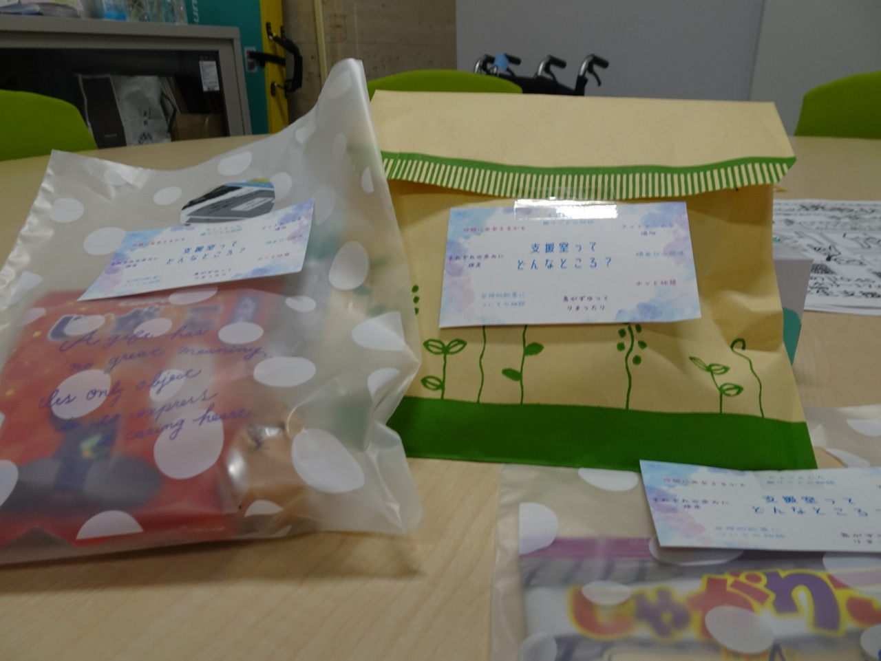 第1回目の6月13日(金)には、「手話」や障がい学生支援室の存在を知らなかった学生が多数謎解きに挑戦し、障がい学生支援室を訪ねました。お菓子セットを手にした時の学生たちの笑顔が印象的で、「手話」と障がい学生支援室の存在を少し身近に感じて頂けたのでではないかと思いました。またお菓子セットには、QRコードから障がい学生支援室のページに入れる「支援室ってどんなところ?」というカードを添付するとともに、「学生によるかんたん手話講座」(6月20日・27日、7月4日)の案内も行いました。