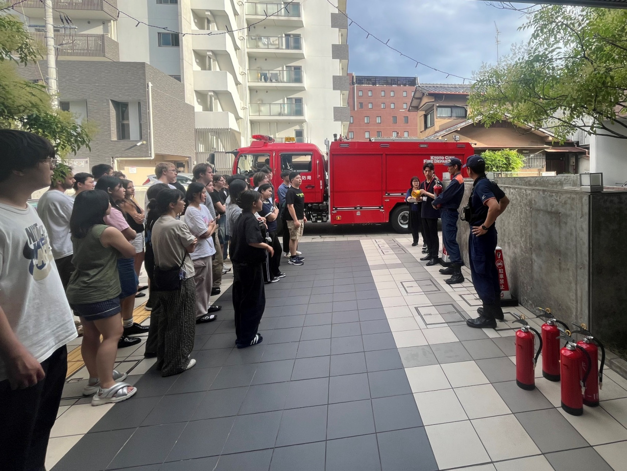 当日は、実際に寮で火事が起こったという想定で我々レジデント・サポーターが留学生に避難指示を出し通報します。りゅうこく国際ハウスでは、伏見消防署の方が来て下さり、避難訓練、通報訓練及び消火訓練を行いました。消防隊員さんからの講評では、「火災時には、必ず階段を使うこと」、「小さな火の時には消火器で消火し、大きな火の時はすぐに避難する」など、具体的で実践的なアドバイスをいただきました。