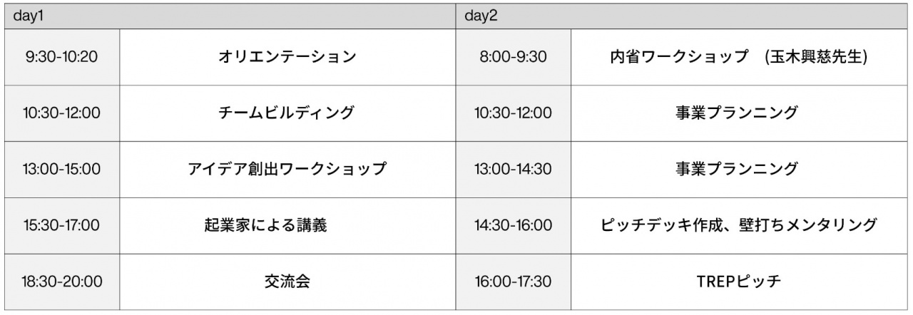 深草キャンパスのTREP(創業支援ブース)で、8月20日(水)-21日(木)の日程、1泊2日の合宿形式でワークショップとレクチャーを行います。合宿後、9月、10月に1回程度ワークショップを行い、11月開催予定の報告会で検討した内容を発表します(9~11月の予定は、受講者の確定後、予定に合わせて追って調整します)。
