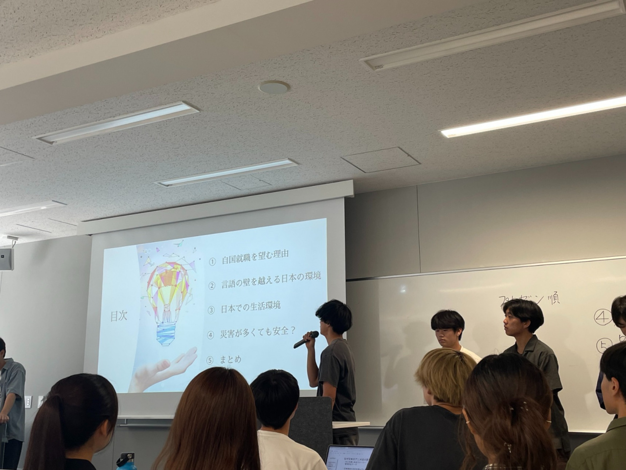 複数の学部から集まった39名の1年次生と留学生が6グループに分かれ、「留学生に勧めたい日本で働く良さ・魅力」をテーマに、プレゼンテーションの準備を進めました。各グループの発表では、工夫を凝らした構成やスライド、丁寧なデータ分析などが光り、「伝わる」プレゼンテーションが展開されました。