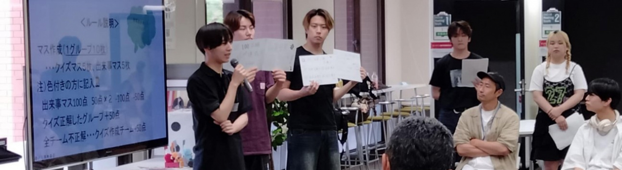マス目が完成したら、楕円状に並べ、それを囲むように椅子を配置して人生ゲームがスタート! 司会役の学生たちの軽快なトークで場を盛り上げつつ、お手製のサイコロを順に振って、出た数のマス目を進みます。移動した先のマス目をひっくり返せば、先ほど用意した得点を獲得したり、4択クイズによって得点を競い合います。 人生ゲームをプレイすることで,学生たちは社長さんの人生を追体験できる仕組みになっています。