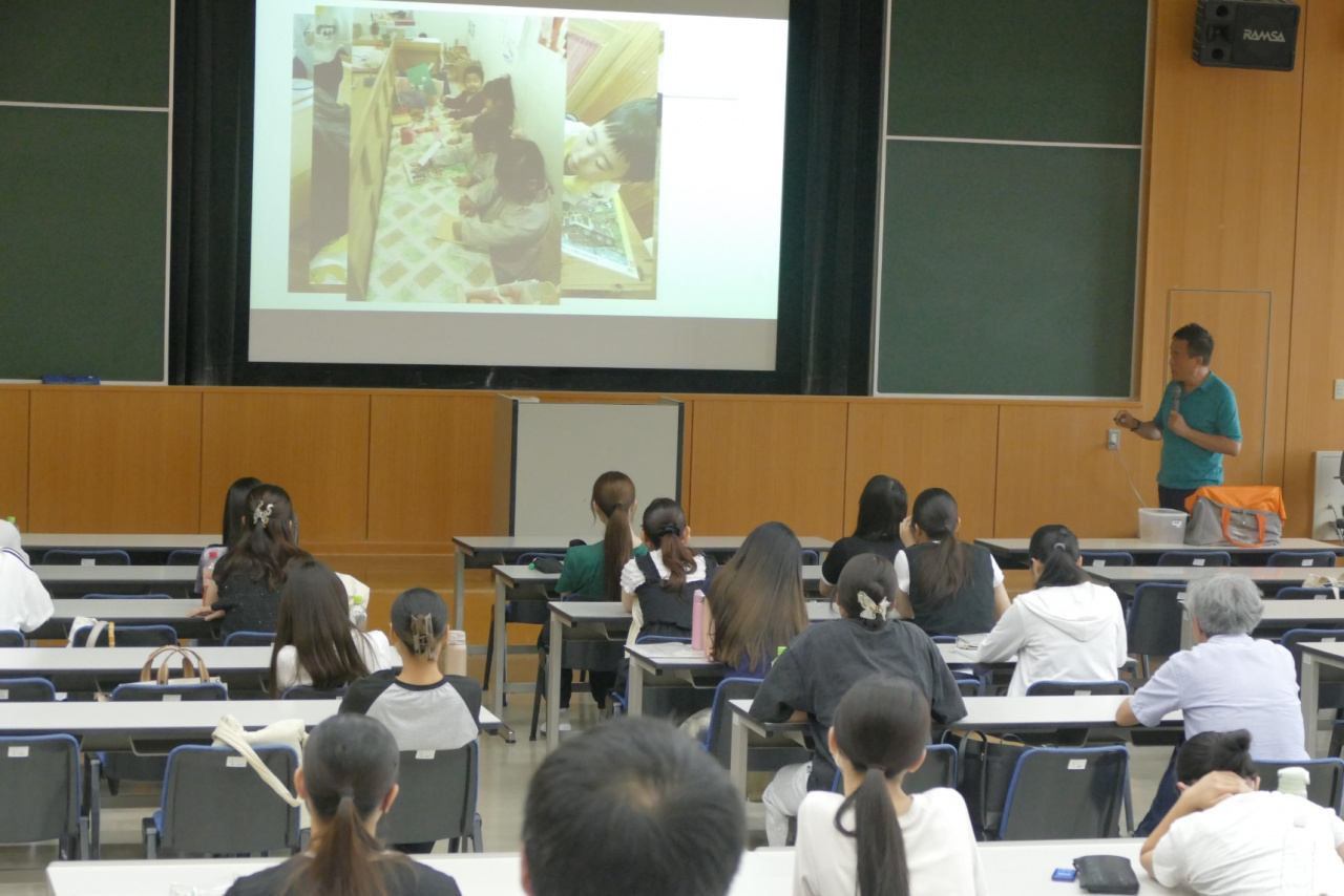 遊びの原点にある良質な「おもちゃ」を多数ご紹介くださり、学生たちも興味深く聴いていました。また、イタリアの幼児教育実践であるレッジョエミリア・アプローチをもとにしたプロジェクト保育の基礎理論とその実践から、子どもの興味・関心、また好奇心を尊重すること、遊びのなかに「学びの芽」を育む重要性を力強く説いておられました。乳幼児期に仲間と一緒に思い切り遊ぶことを通して、子どものなかに「自分で感じ、考え、判断し、行動できる」自信と喜び、そして「生きる力」を育むことの大切さを理解することができました。