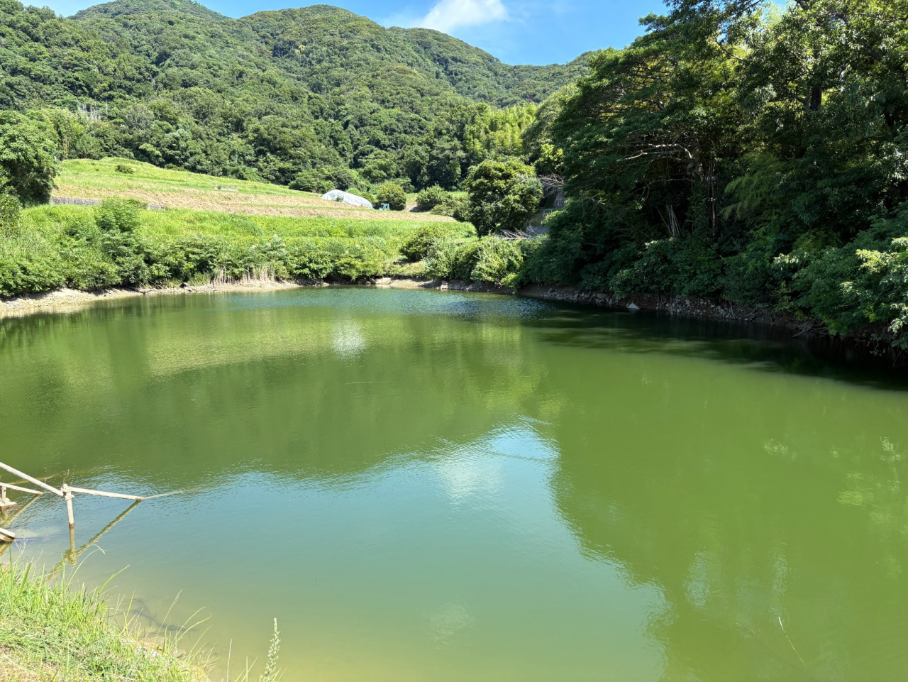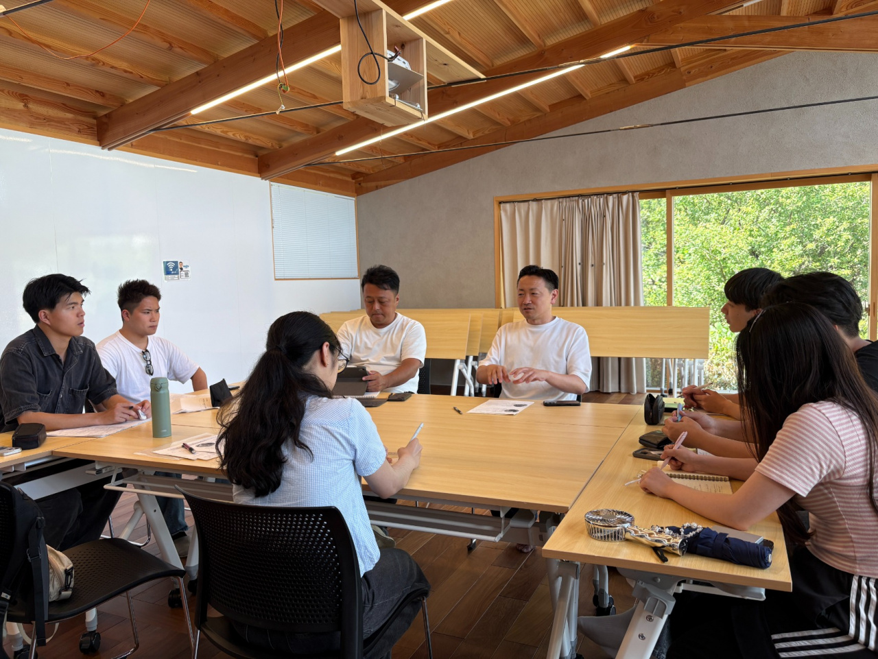 翌日の午前中は大森谷の大ばね池へ行き、11月30日に予定されているかいぼり(ため池の泥かき)について話を聞きました。この地域では上池と下池の二つの池で毎年交互にかいぼりを行っていますが、池を管理する田主(たず)の高齢化と人手不足が年々深刻になっています。よりまち荘に戻り、市役所の高橋さんを交えてかいぼりチームビルディング研修の内容を詰め、参加団体・地元企業・田主・学生のあいだでWin-Winの関係が築けるか検討しました。