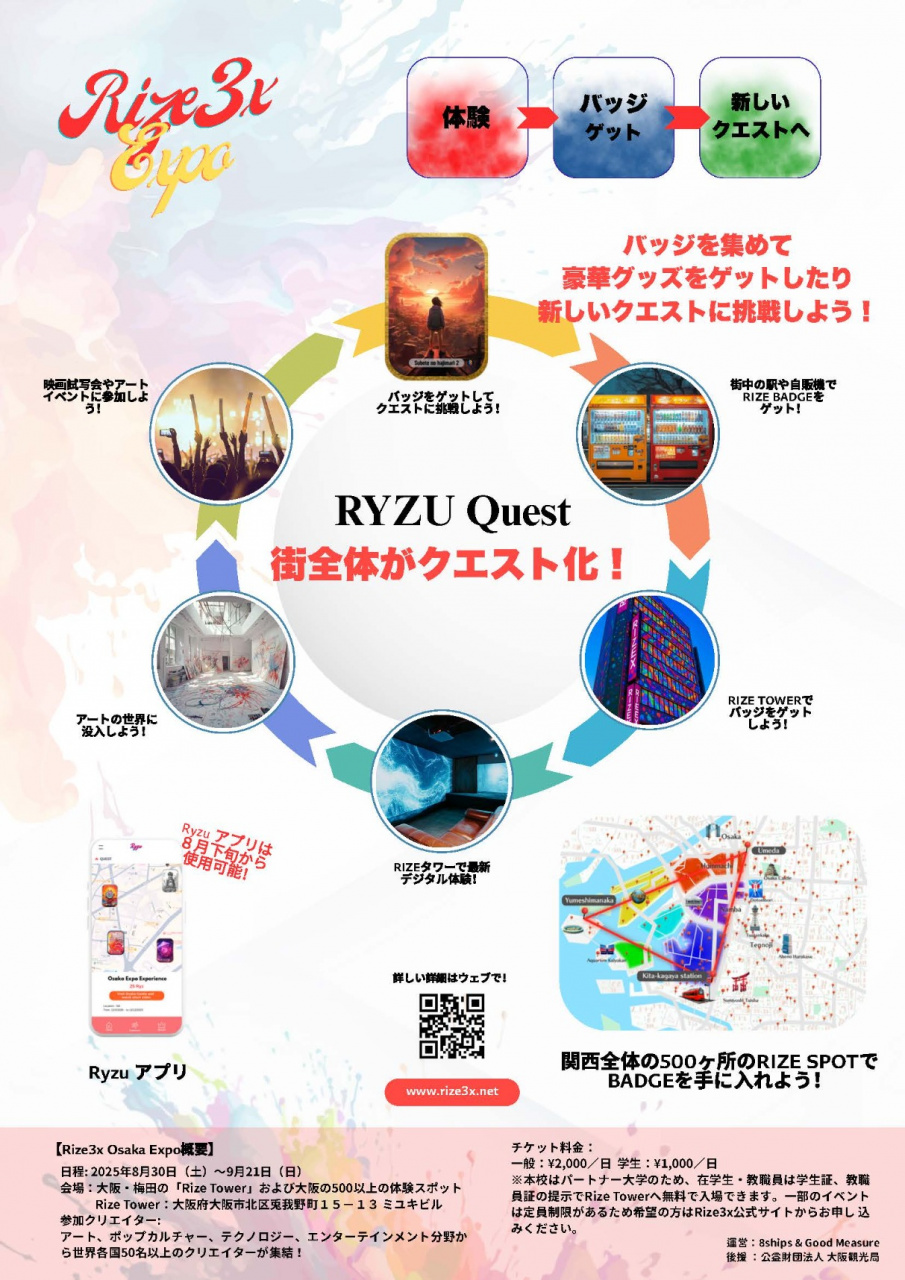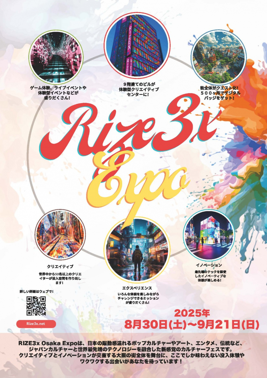 2025年 8月30日(土)から9月21日(日)まで、「裏万博」とも言える、デジタルクエストとリアル体験を融合させた体験型カルチャーフェスティバル「RIZE3x Expo」が開催されます!大阪の街全体を舞台に、クリエイティブとイノベーションが交差し、ここでしか味わえない体験や出会いがあなたを待っています。