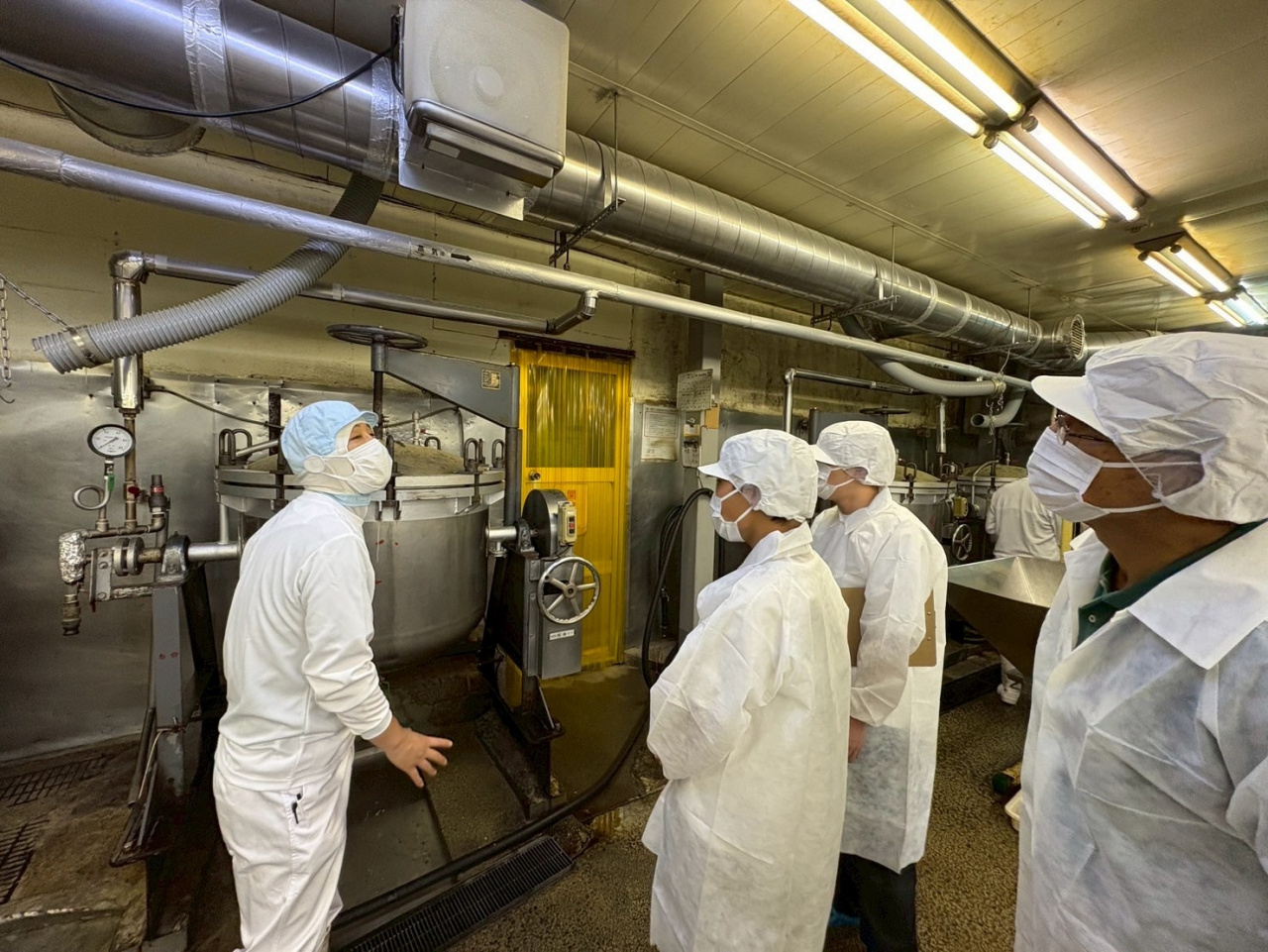 その後、工場での納豆製造工程を間近で拝見させていただきました。工場見学では、原料の大豆の浸漬時間が大変重要なことや、豆の種類や性質に応じて納豆菌の配分を変更すること、発酵の際に必要な細やかな温度調節などを学ぶことができました。工場見学後には質疑応答にもご協力いただきました。