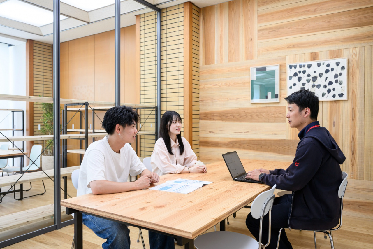 施設内は、無印良品を展開する「株式会社良品計画」が家具や内装のデザインを監修しました。本学深草キャンパス施設整備の「深草を森にする」というコンセプトと調和し、天然木などの自然素材を生かしたシンプルで明るい空間に、オフィスグリーンを多く配置することで、訪れる学生や働く教職員にとって居心地の良い空間を実現しました。また、ミーティングスペースやカフェワークスペースを設置しています。職員間のコミュニケーションの活性化を促し、横断型業務やプロジェクト型業務など、業務内容に応じた柔軟な働き方を可能にするオフィス環境を整備しています。