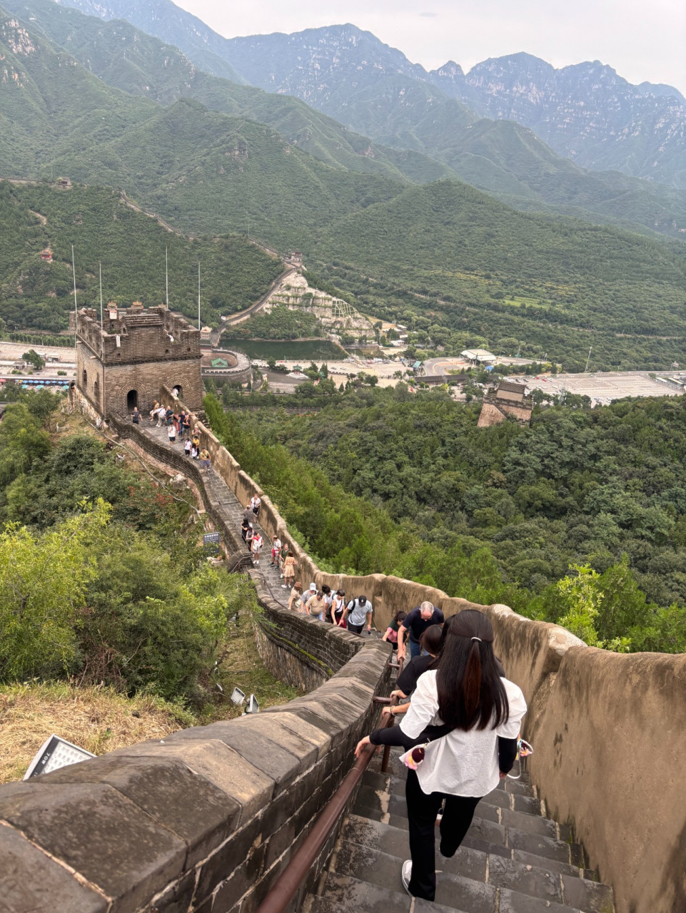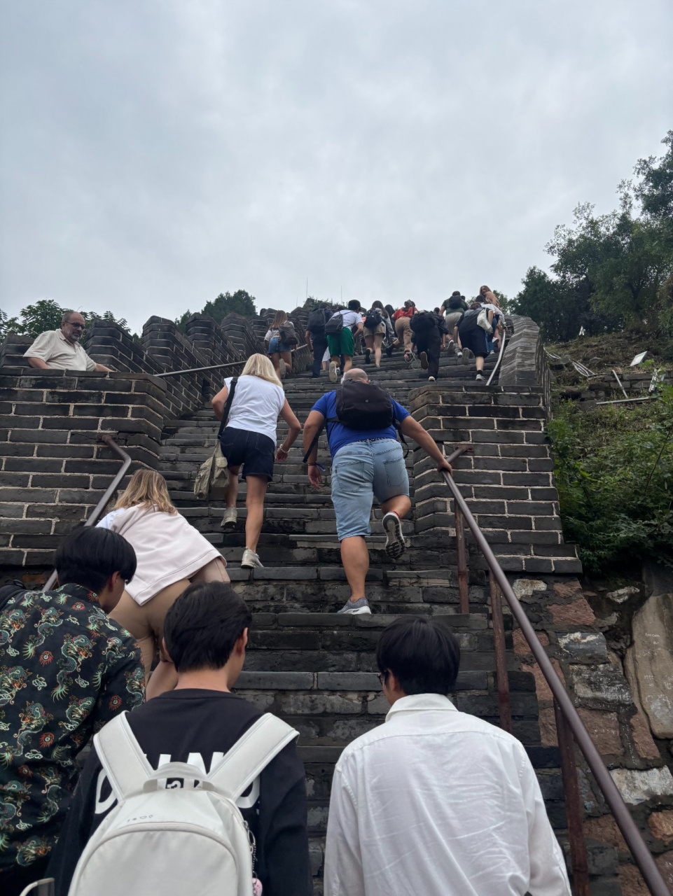 まず、最初に訪れたのは万里の長城です。北京外国語大学の生徒たちと共に参加したこの活動では、私たち山西省グループの日本人と中国人学生の人数差がありましたが、私たちのコミュニケーション力が存分に発揮され、ずっと中国の学生たちと交流しながら観光を楽しむことができました。万里の長城は私の予想をはるかに超えて長く、高く、急勾配で、まるで山登りをしているような感覚でした。「もし私が敵だったら、絶対こんな厳しい場所から攻めない!」と思いながらも、必死に上を目指して登りました。それでも、古の人々が敵から自分たちや家族を守るために作り上げたものを、実際に目の当たりにしたことは、まさに教科書で学んだ歴史の中でしか見たことのない壮大な光景でした。こうした経験は、私にとってかけがえのない思い出となりました。