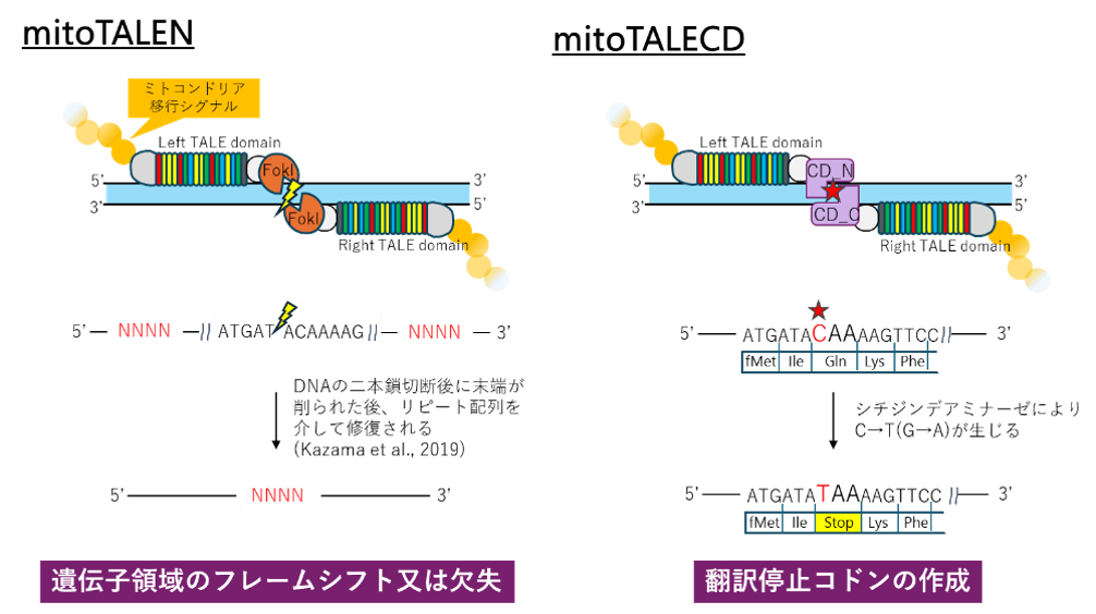 現在、ゲノム編集では、CRISPR-Cas9法を用いることが一般的ですが、ガイドRNAをミトコンドリア内部に輸送できないため、この方法はミトコンドリア遺伝子の編集には適用できません。そこでDNA結合モジュールがタンパク質で構成されるTALEにミトコンドリア移行シグナルを付加したmitoTALEが開発され、FokⅠを介したDNA切断による編集法(mitoTALEN法)と、FokⅠの代わりにシチヂンデアミナーゼを用いたC→T(相補鎖ではG→A)の1塩基置換による編集法(mitoTALECD法)が確立されました。