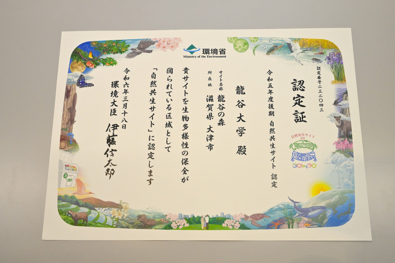 瀬田キャンパスに隣接し、約38haという広大な土地に広がる「龍谷の森」は、学生向けのフィールドワーク実習の場として利用するとともに、地域住民と連携した取り組みも行ってきたことなどにより、生物多様性が保全されている点が評価され、2024年3月18日に関西の私立大学で初めて環境省の「自然共生サイト」に認定されました。