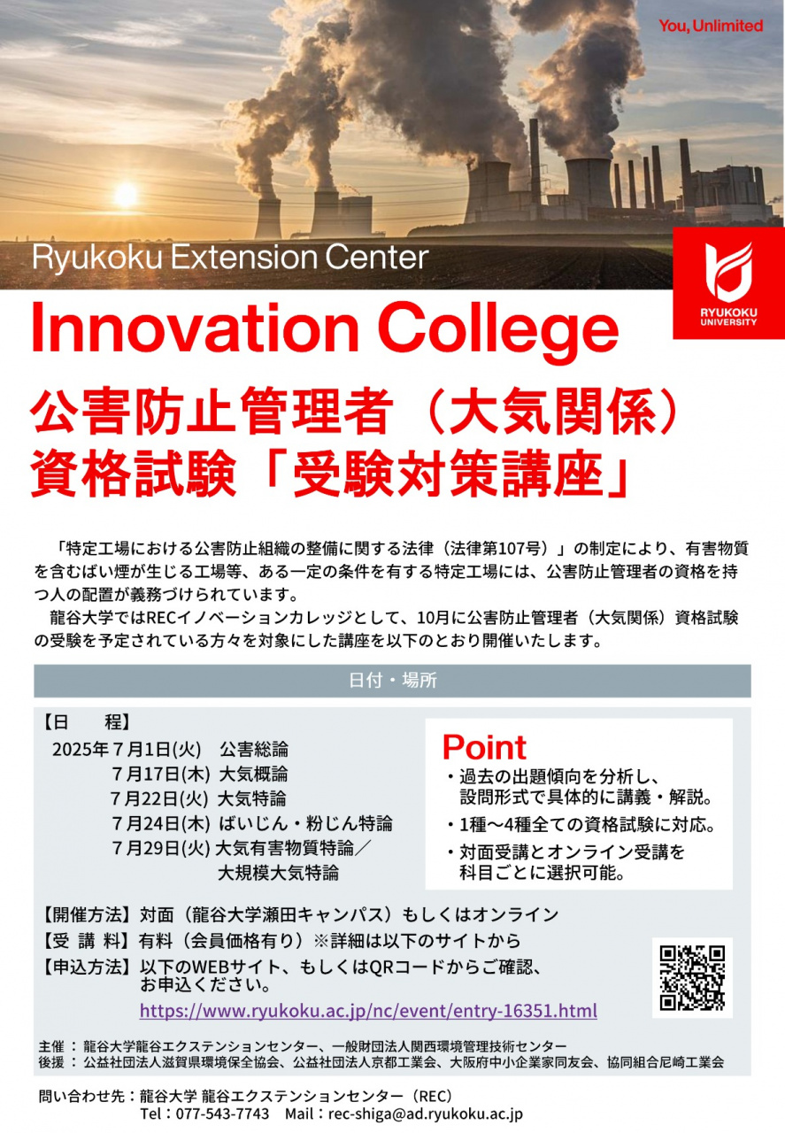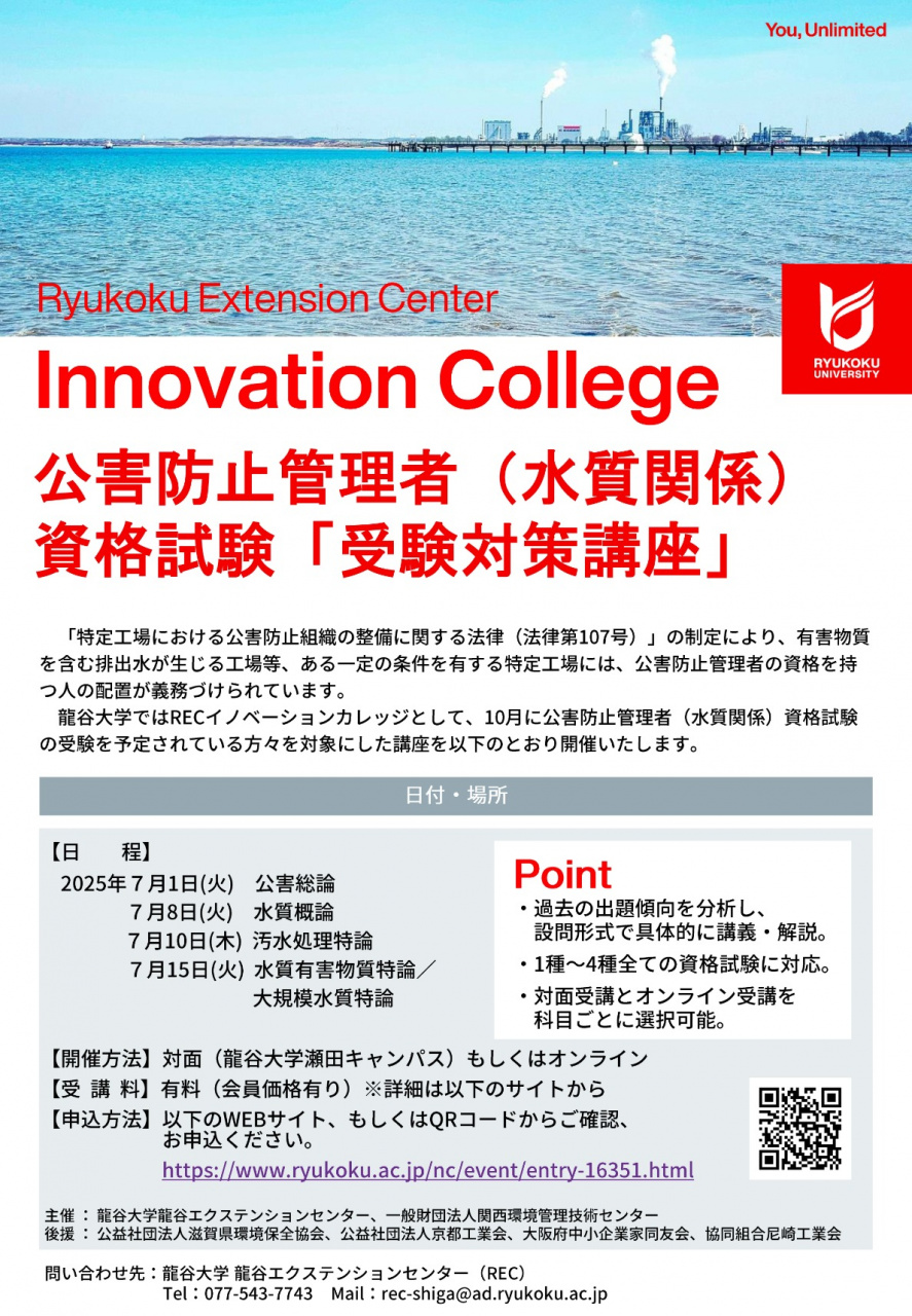 龍谷大学ではRECイノベーションカレッジとして、公害防止管理者(水質関係)(大気関係)資格試験の受験を予定されている方々を対象とした講座を以下のとおり開催しました。