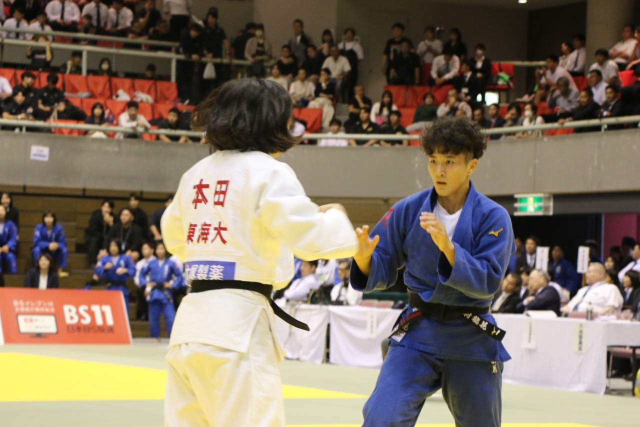 初日から配列が変わった2日目の準々決勝は、大会4連覇を目指す王者東海大学との大一番を迎えます。ここは先鋒が引き分け、次鋒が一本負けで追う展開になると、その後も4人が引き分けられ、勝負は大将戦に託されます。その大将戦は、木村選手が開始から強引に勝負に出ていくも取り返すことが出来ず、試合終了となりました。1点が勝負を大きく分ける結果となり、春の優勝大会に続き悔しい5位に終わりました。