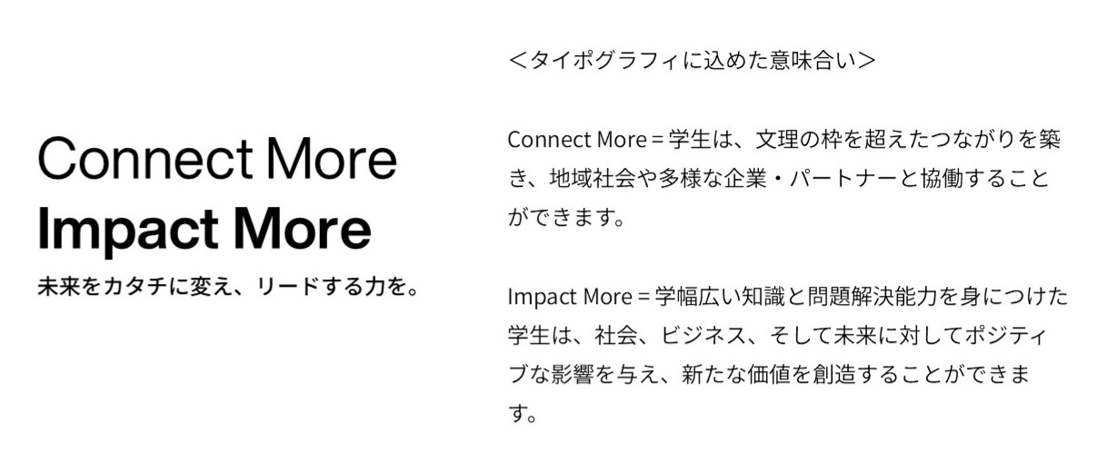 タイポグラフィは、龍谷大学の目指す印象「リアルな問題に目を向け、社会にインパクトをもたらす大学」を表現するために、文章を力強く、ダイナミックにレイアウトしたデザインの仕組み