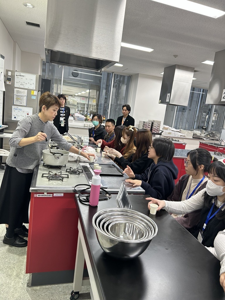 講義では、昆布とカツオ節を使った出汁の取り方が実演され、来訪学生たちは試飲を通じて和食の基本について理解を深めました。