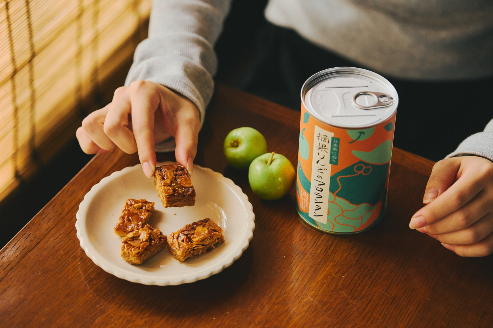 プロジェクト第一弾として開発された「日本茶に合う 摘果りんごのフロランタン」は、大人向けのほろ苦い新感覚のフロランタンです 。