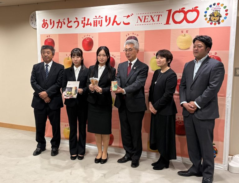 10月31日(金)に、藤岡ゼミの学生と藤岡教授が弘前市長を表敬訪問し、新商品の完成を報告しました。