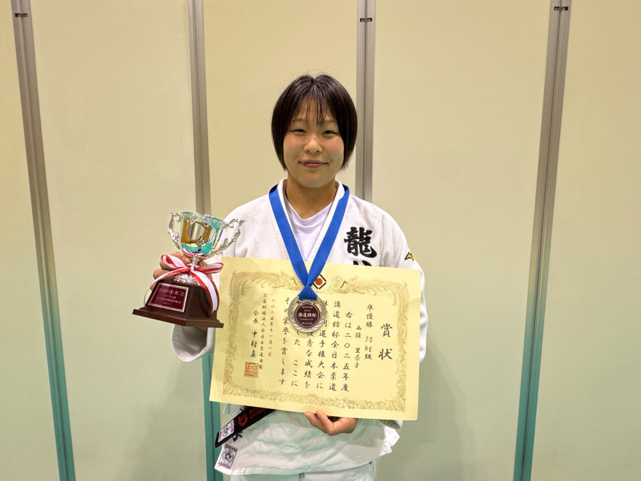 2025年11月1日(土)、千葉ポートアリーナにて、2025年度講道館杯全日本柔道体重別選手権大会が開催され、本学柔道部からは今年度の全国大会で優秀な成績を収めた女子9名が出場権を獲得し出場いたしました。その中で、女子70㎏級の西條 里菜子選手(営4)が準優勝に輝きました。