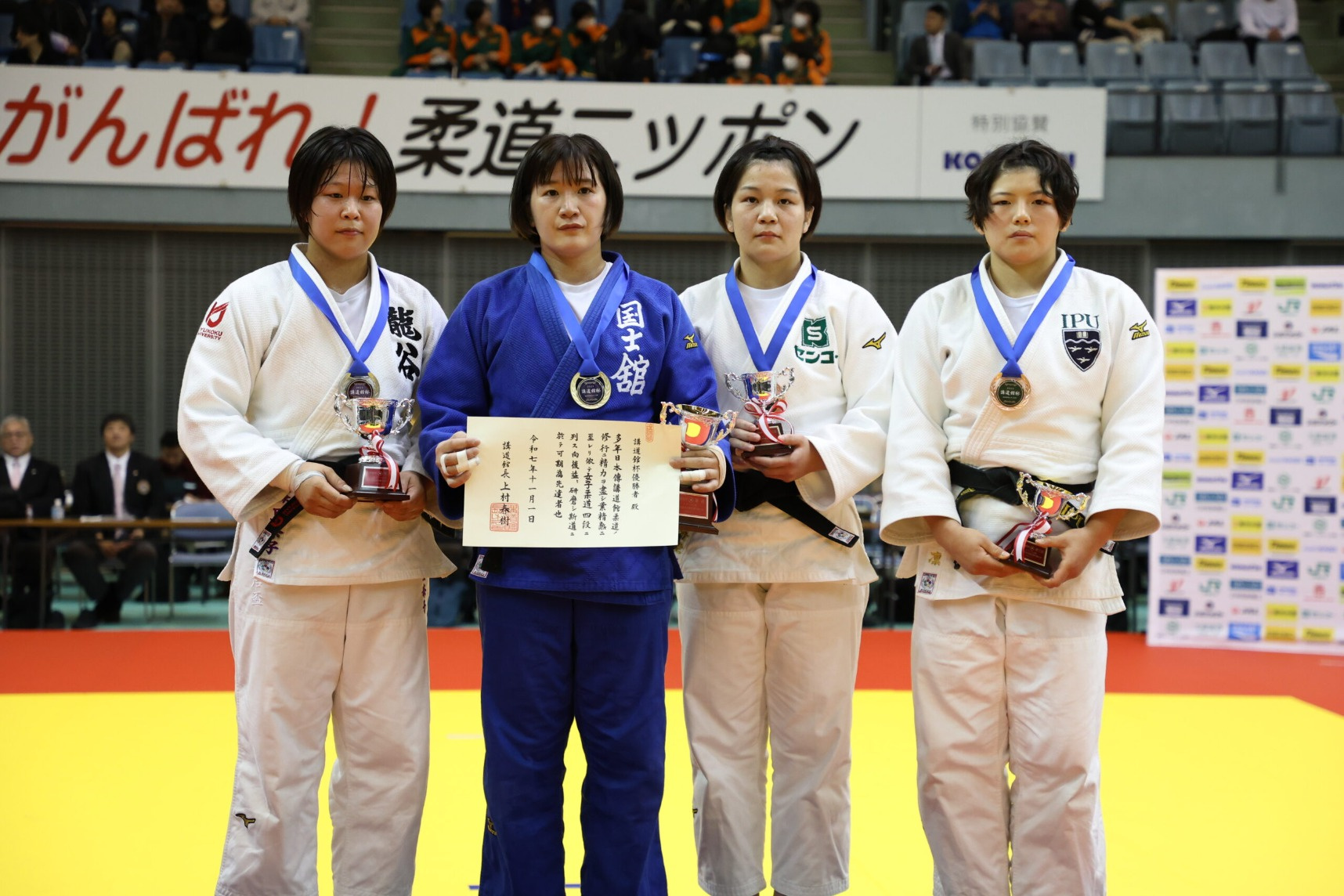 さらに、本学柔道部OGで48㎏級の森 結愛選手(ヤックス/22法卒)が準優勝、63㎏級の檀野 芽紅選手(コマツ/23営卒)が3位入賞を果たされ、卒業生の活躍も目覚ましい大会となりました。
