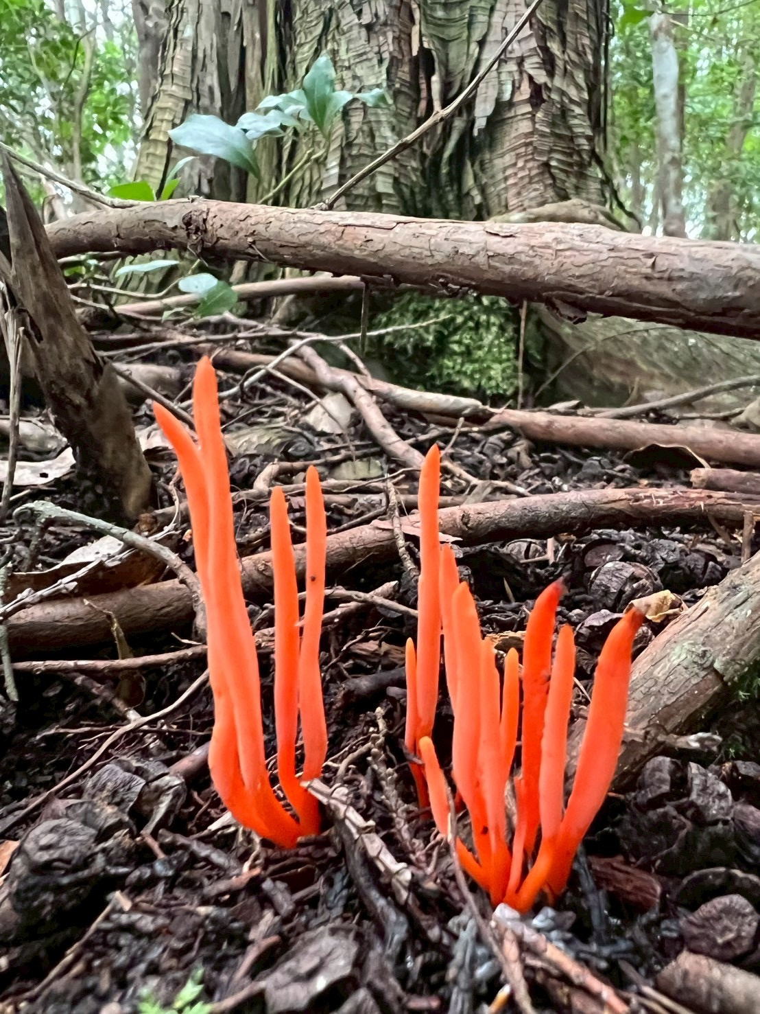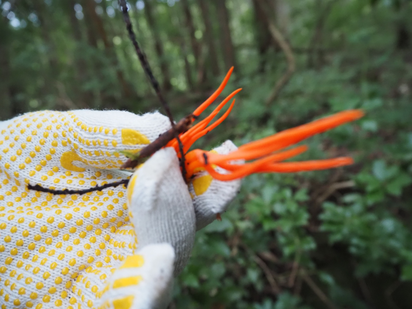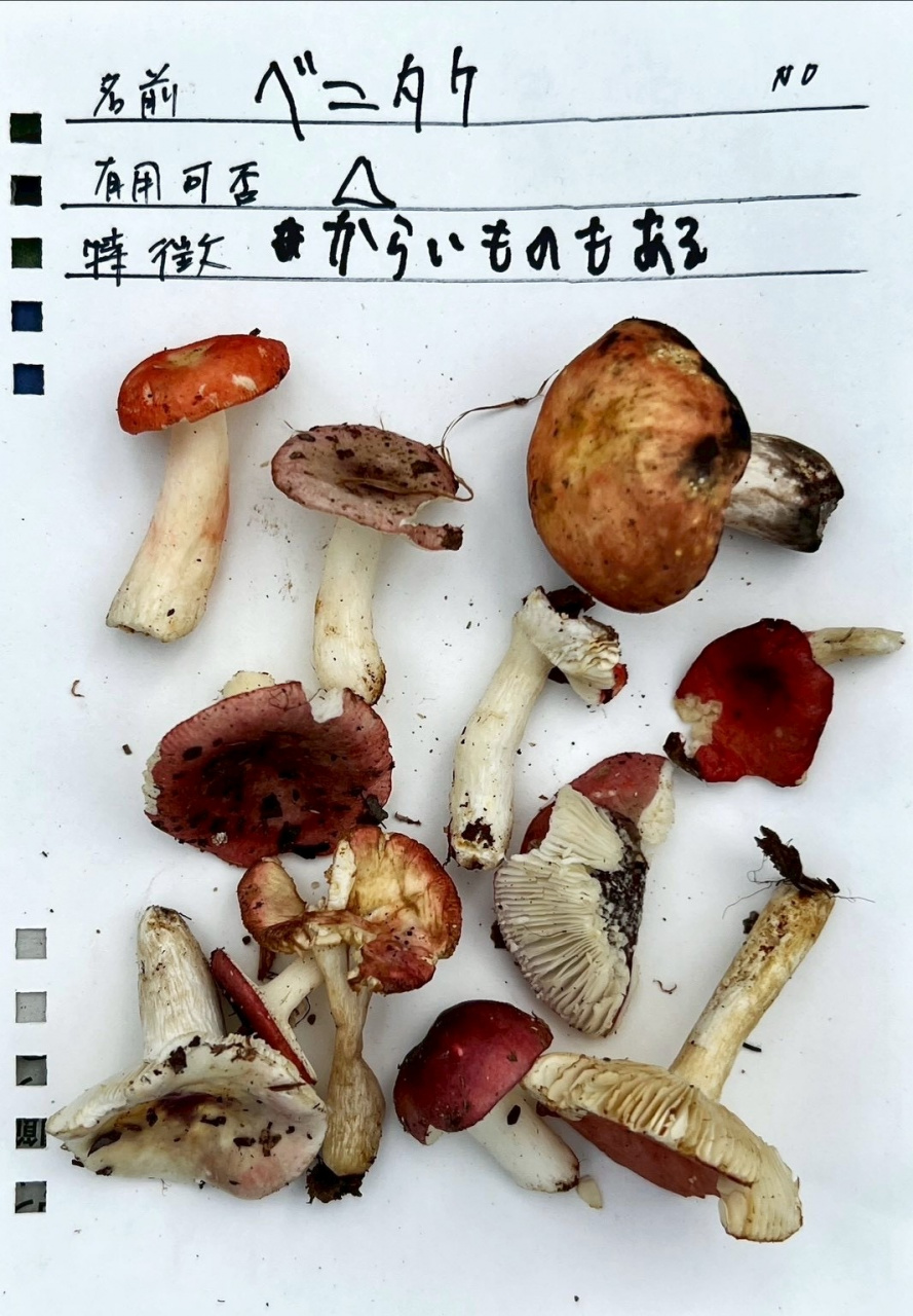 昨年度に続き、京都府林業技術センターの藤田さん(専門はキノコ、学生たちはキノコ博士と呼んでいます)を講師に招き、地域の方とマツタケ山に入りました。時期的に少し早かったため、残念ながらマツタケはまだ見つけられませんでしたが、他の多様なキノコを観察することができました。