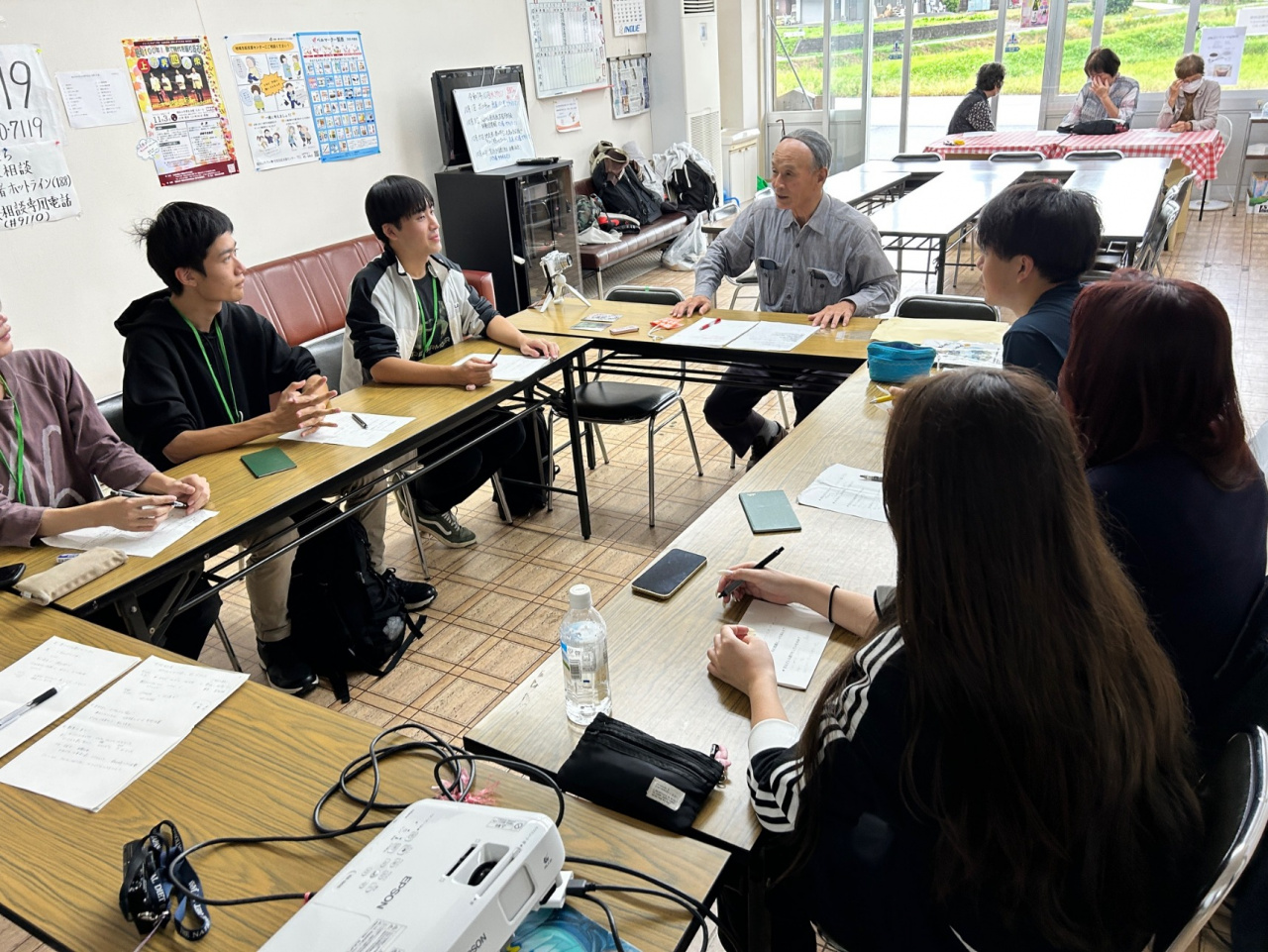 ててまる。班は、里山利用の調査の一環として、地域の高齢者の方々(80代中心)からガスが普及する前に薪などを利用してどのように生活していたのかについて、体験談を伺い記録する活動をおこないました。ご協力いただいたのは大内集落の堀宗一さん(写真左下)土家安子さん、吉田和子さん、山本弘子さん(写真右下 左から順に)です。学生たちは中六人部での生活全般に山の木を利用していたこと、かつてマツタケの一大産地であったこと、ガスが普及した当時の生活変化等を知ることができました。