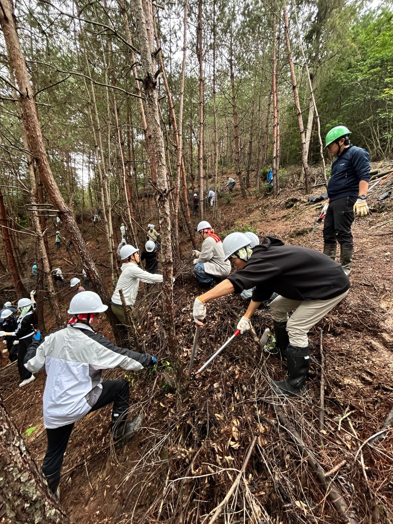 2日目の午後は、大内山田集落の財産区(共有地)で、マツタケ山整備作業を実施しました。この場所は前回整備した場所(尾根)のさらに上の山です。事前に森林組合にアカマツを残し不要な木を切ってもらった枝や落ち葉が集積している場所から、それを崖の下方向に運ぶ作業を中心におこないました。すっかり秋を感じる気候になり、地域からもたくさんの方が作業に参加くださり、楽しんで作業を進めることができました。