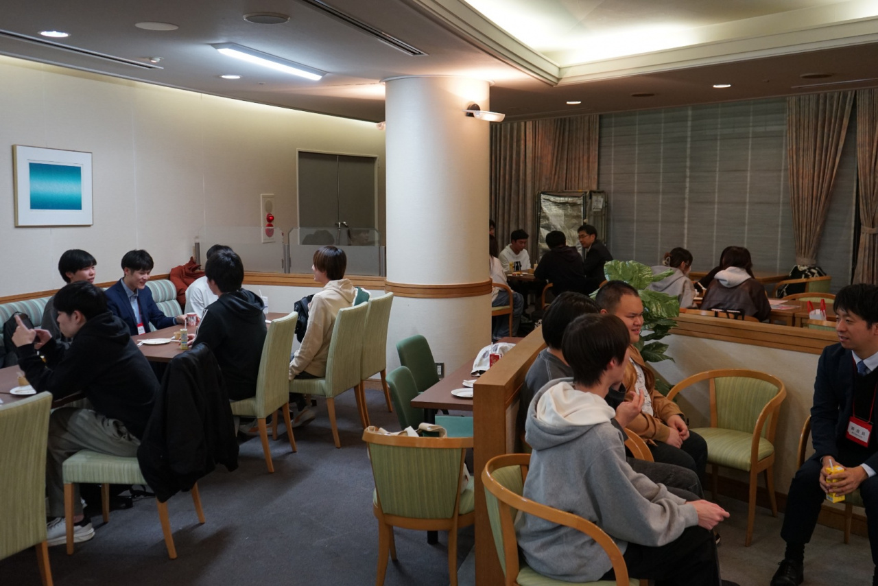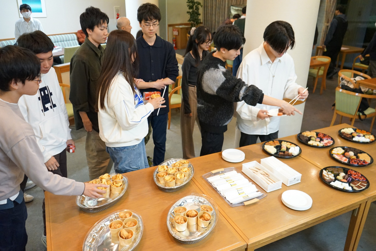 また、表彰式終了後には、軽食交流会を実施し、審査企業と学生・教員の間で、取り組んだ企画の話(学生)や現場で起きた摩訶不思議な話(企業)などで、盛り上がりました。